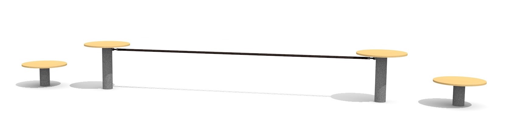 Slackline 7 cm breit mit Spannmechanismus, Stahlpfosten verzinkt, Standflächen in einheimischer Weisstanne KDI, auf Anfrage in Douglasie oder Robinienholz unbehandelt.