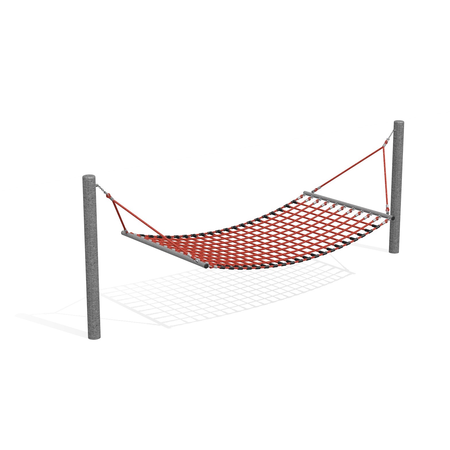 XL-Schaukelfläche 250 x 150 cm, aus Herkulesseil mit Kugelknotenverbindungen, wartungsarme Schwenklager, Stahlrohrstützen verzinkt.