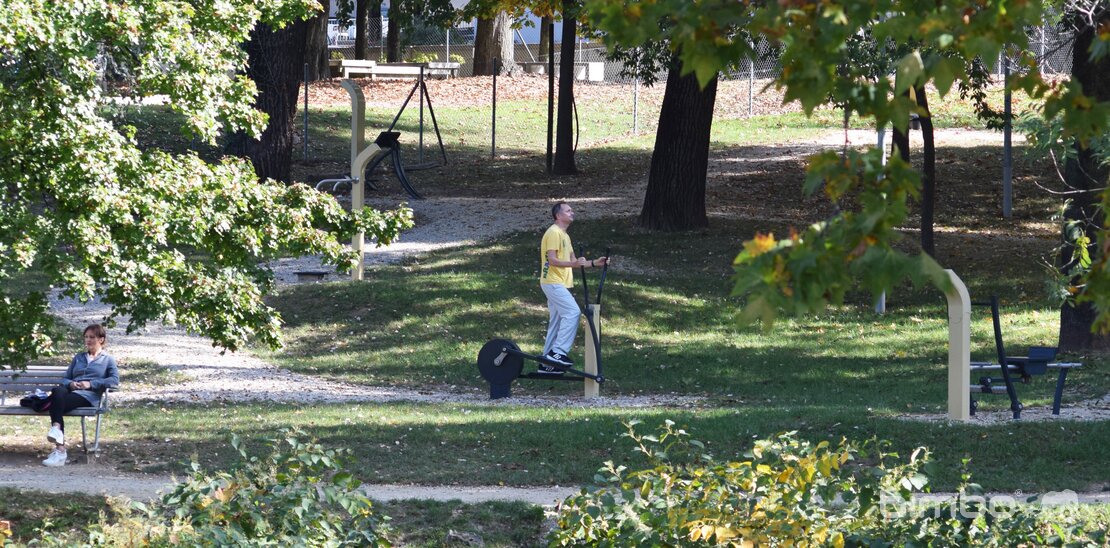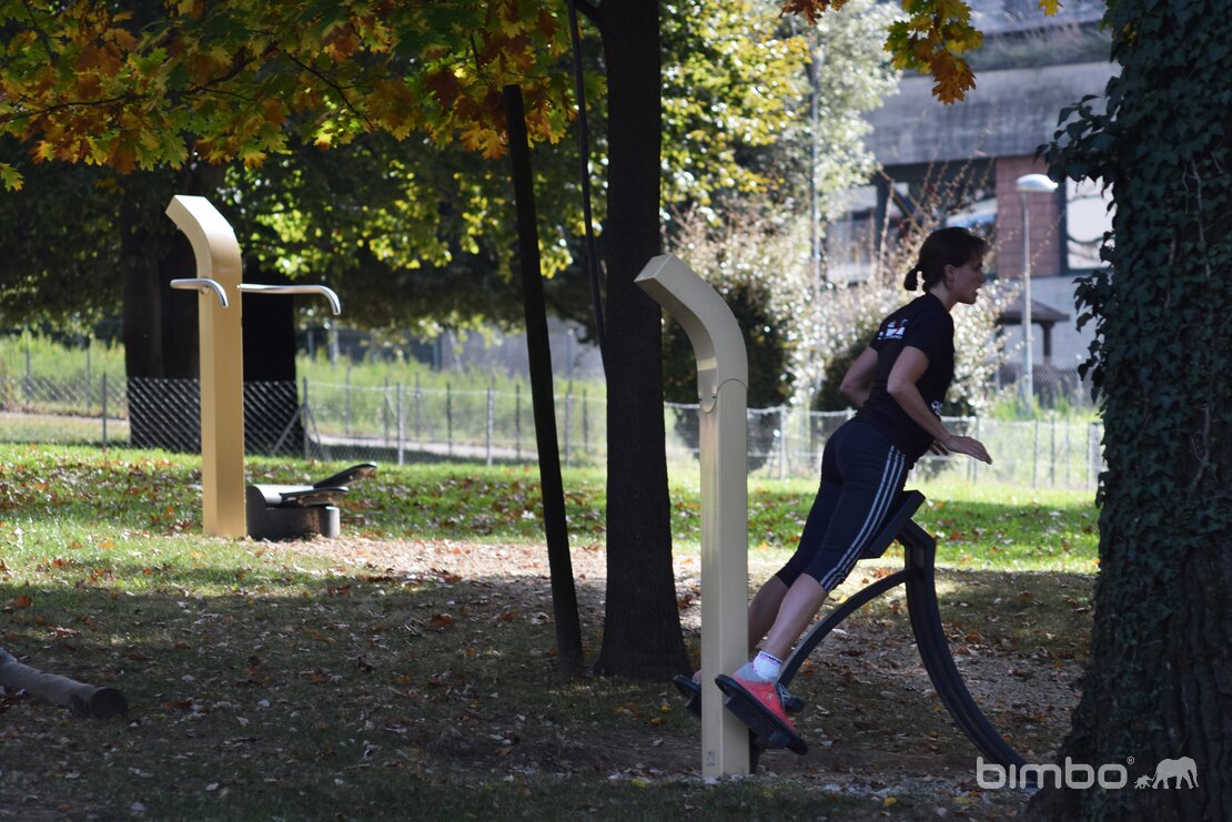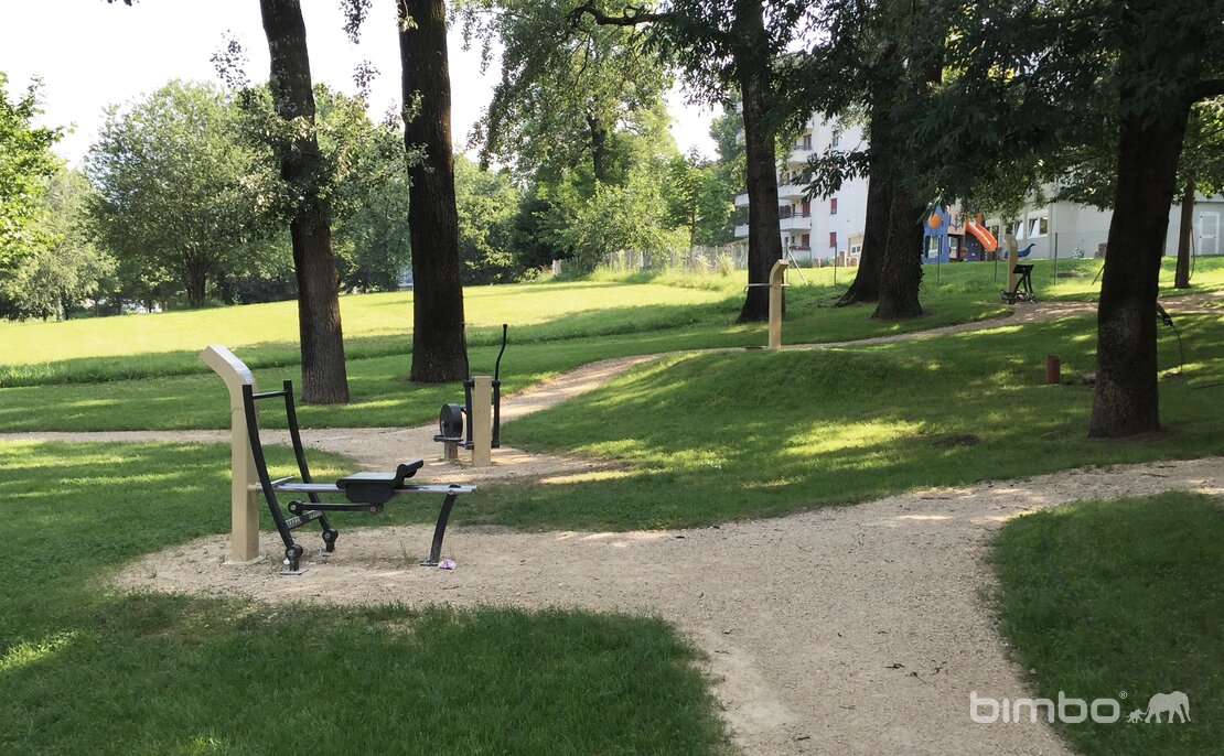 Bewegungsparks laden zum Benutzen ein. Die Nähe zum Sportzentrum zieht gleichzeit auch Vereine an. Das dezente beige der Stahlgeräte passt gut in die grüne Umgebung - ebenso wie die Gestaltung der