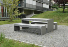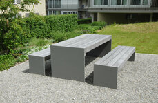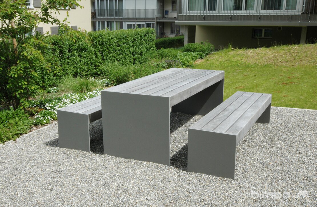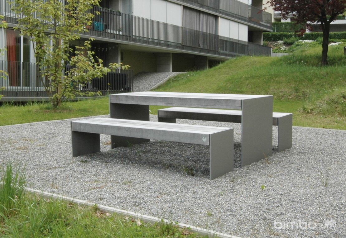 Einfache Sitzbänke und Tischkombinationen. Diese ästhetischen Produkte überzeugen auch betreffend Langlebigkeit. Auflagen in unbehndeltem Hartholz. Seiten in Stahl verzinkt und antrazith beschichtet.