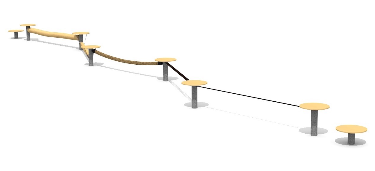 Mit Slackline, Dschungelseil, Artistenseil, Wackel- und Drehbalken. Stahlpfosten verzinkt, Standflächen in einheimischer Weisstanne KDI, auf Anfrage in Douglasie oder Robinienholz unbehandelt.