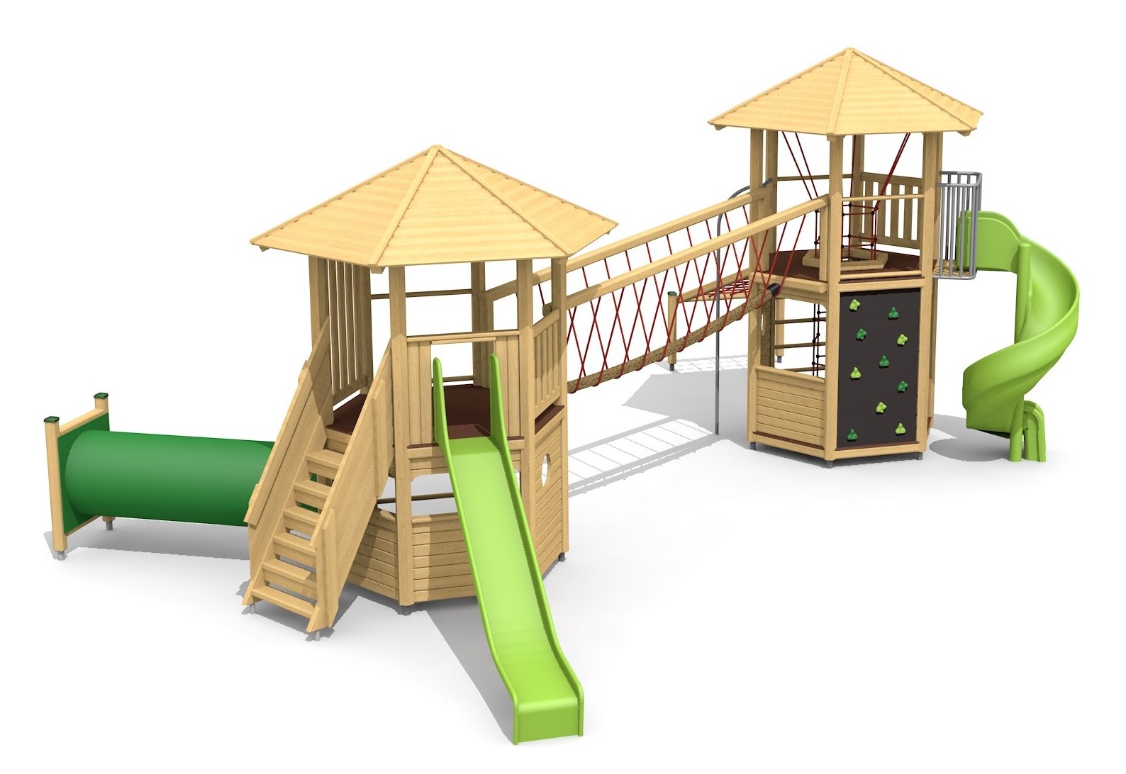 Interessante Spiellandschaft mit verschiedenen Auf- und Abgängen auf allen möglichen Seiten. Unsere Sechseckklettertürme eignen sich besonders gut für vielseitigen Spielwert.