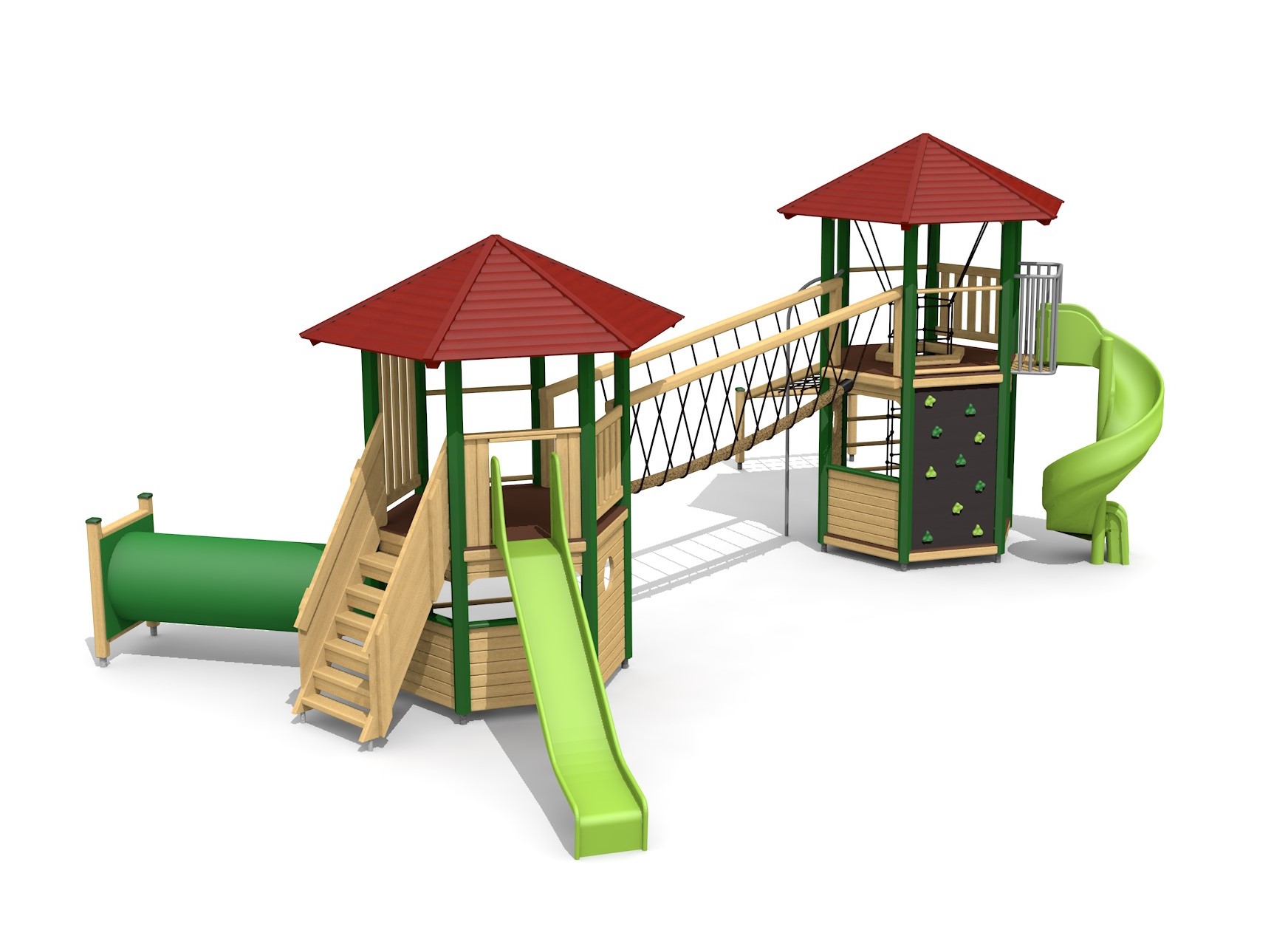 Interessante Spiellandschaft mit verschiedenen Auf- und Abgängen auf allen möglichen Seiten. Unsere Sechseckklettertürme eignen sich besonders gut für vielseitigen Spielwert.