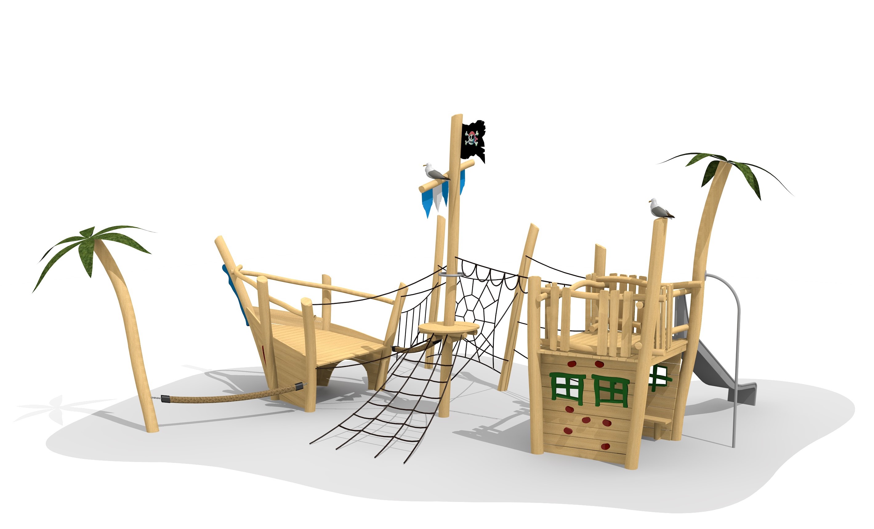 Abwechslungsreiche Themenwelt, welche nicht nur Kindeherzen höher schlagen lässt. Ein Piratenschiff das von allen Seiten beklettert, geentert und bespielt werden kann. Individuelle Kombinationen sind möglich.