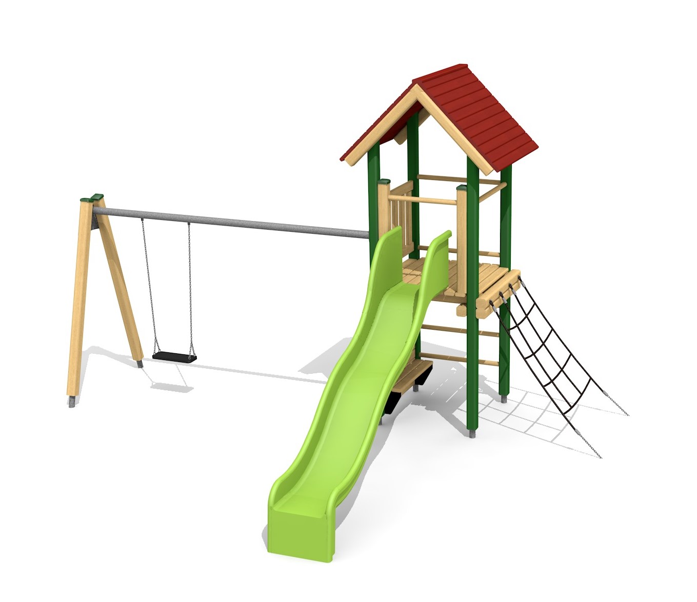 Klassische bimbo Konstruktion in einheimischer Weisstanne KDI, vandalensichere bc-rope Seile, mit verzinkten Stahlkonsolen im Bodenbereich, GFK Kunststoff Rutsche. Oberfläche mit Naturöllasur farbig lasiert.