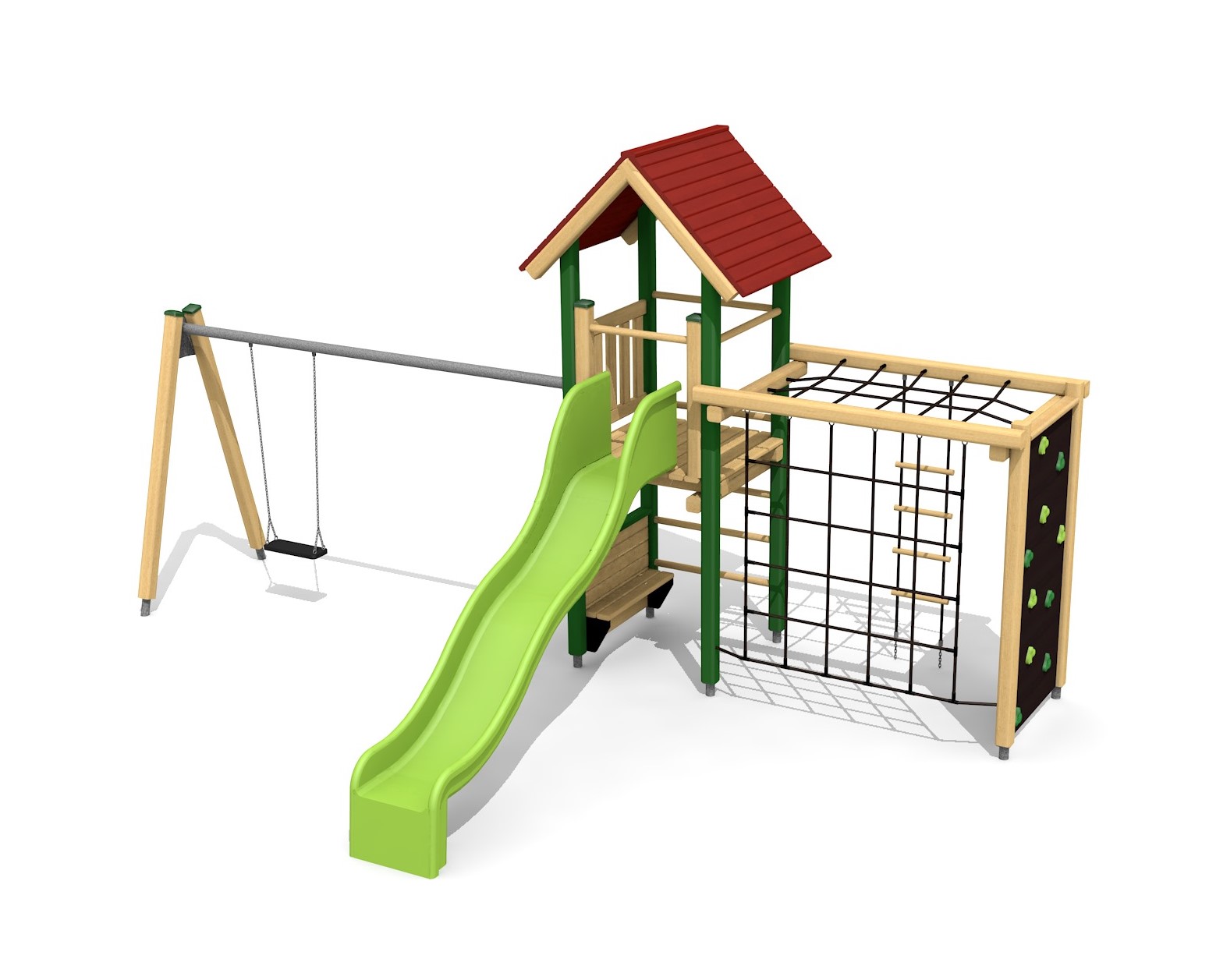 Kleine und kompakte Kletterwelt mit Schaukelanbau.