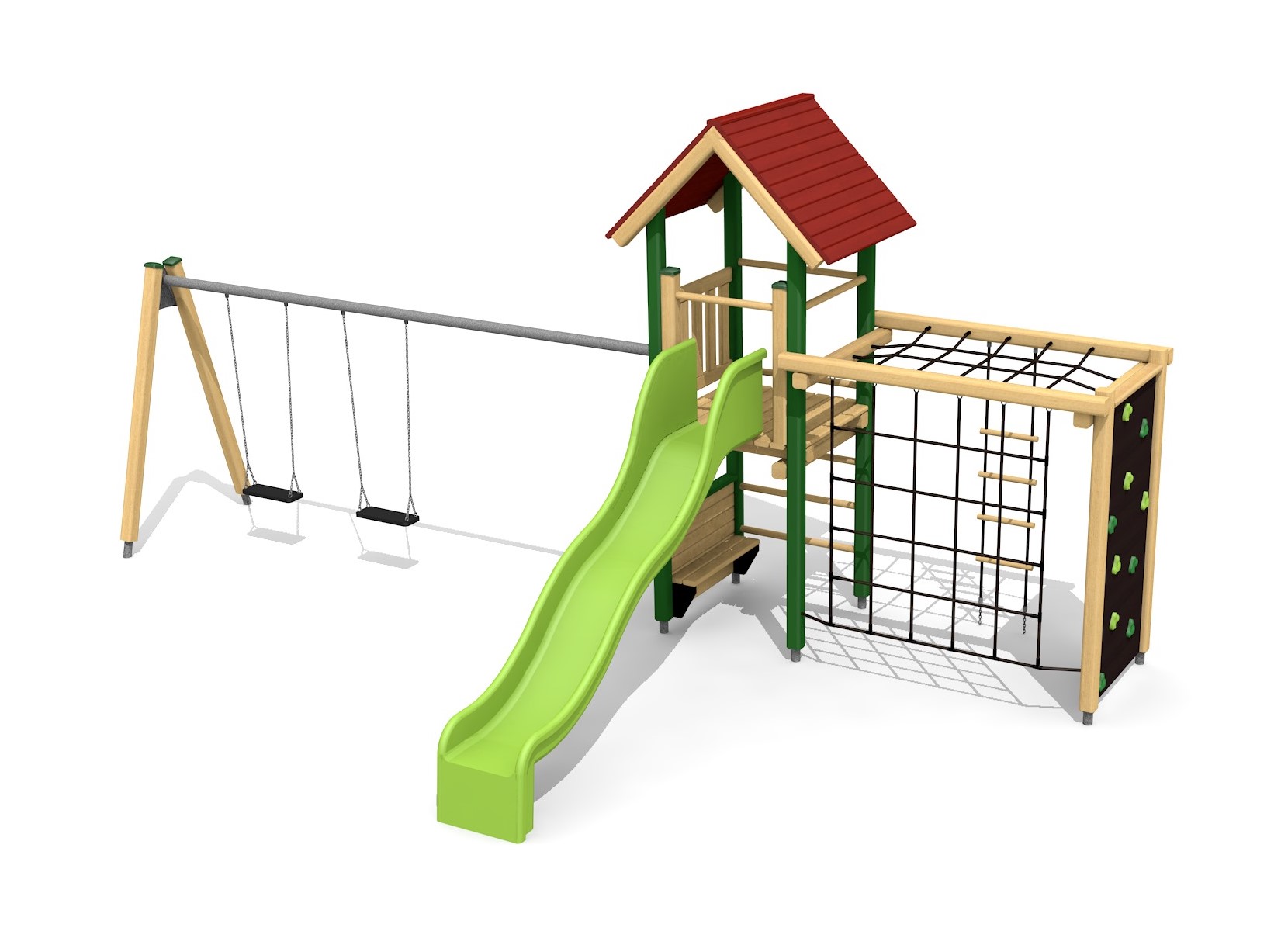 Kleine und kompakte Kletterwelt mit Schaukelanbau.