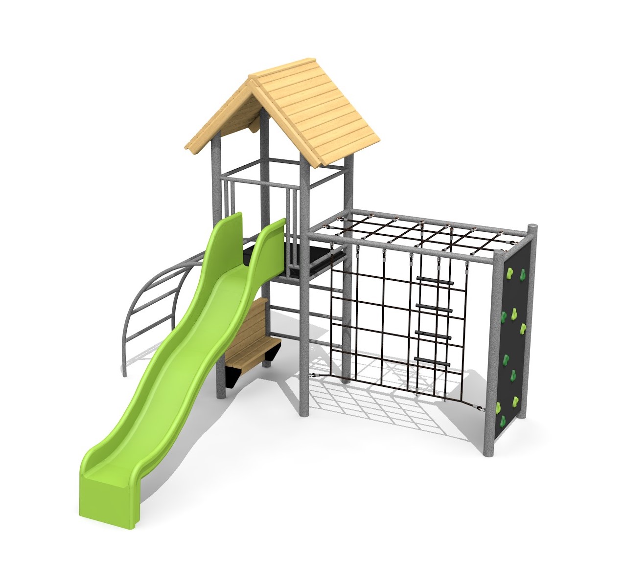 Spielhaus mit Rutschbahn, angebauter Kletterkombination und verschiedenen Herausforderungen.