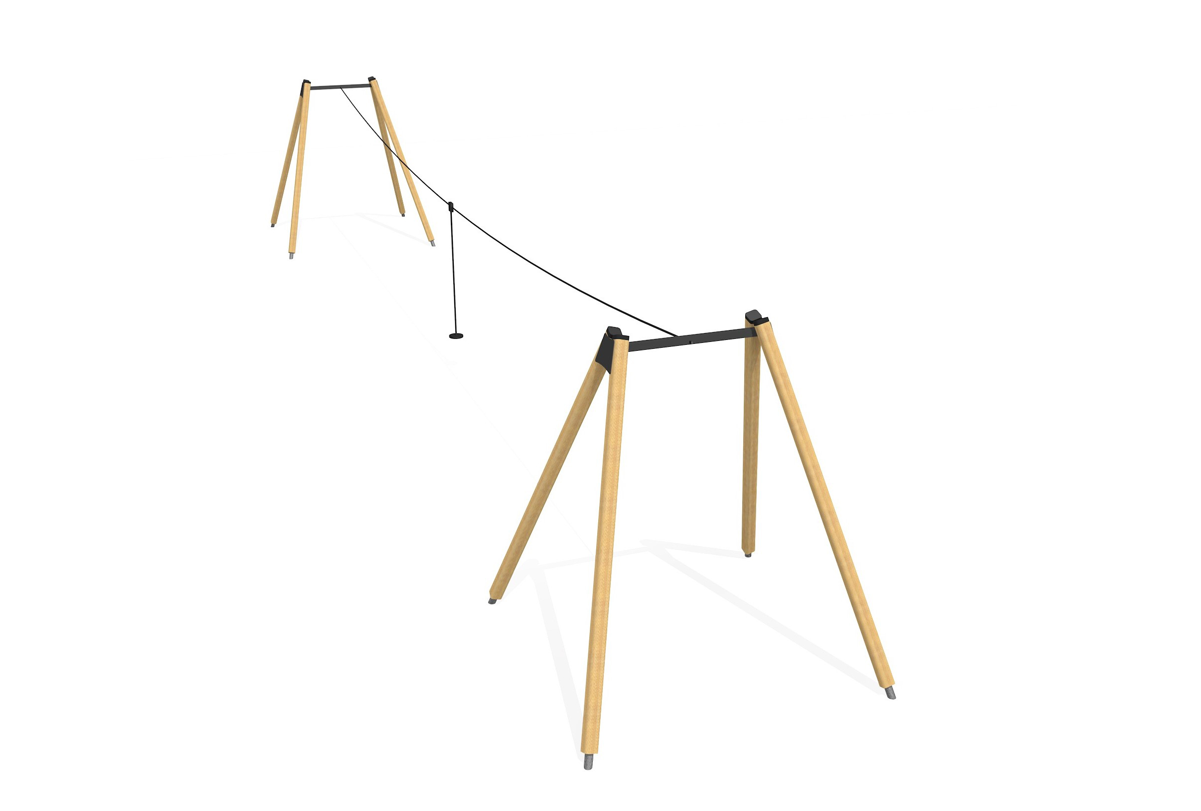 Stabiler Seilbahnsitz mit Kette und Schlauchüberzug, Querträger in Stahl verzinkt und zusätzlich farbig lackiert, Stützen in einheimischer Weisstanne KDI mit verzinkten Stahlkonsolen im Bodenbereich. Wartungsarme und geprüfte Spezial Laufrolle.