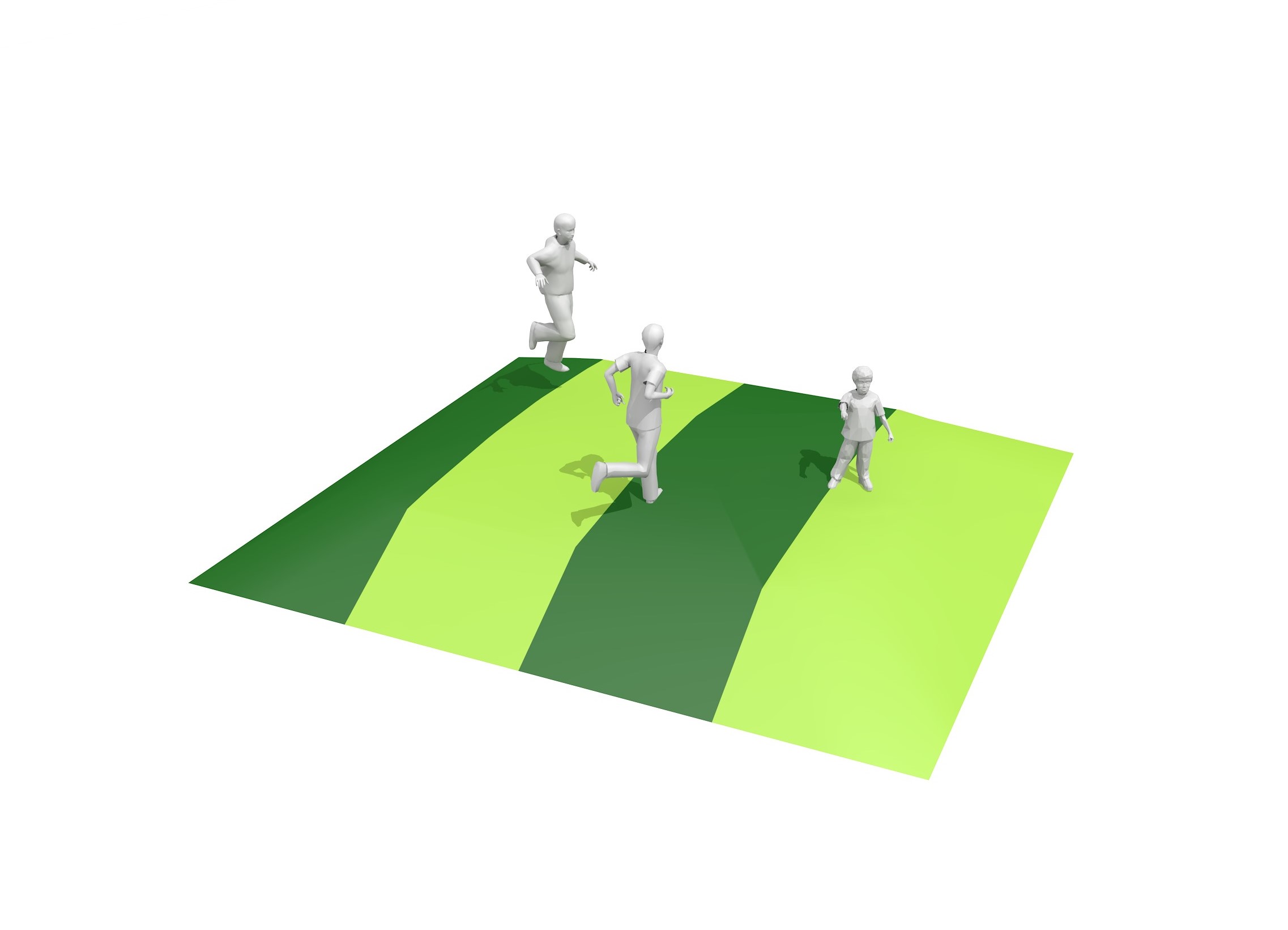 Es wird gehüpft, gesprungen und rotiert. Die dynamische Sprungfläche animiert zum Bewegen und Ausprobieren. Gleichzeitig ist dieses Gerät ein Treffpunkt zum Liegen und Verweilen. Hier trifft man sich. Eine Ebene Fläche ist Voraussetzung.