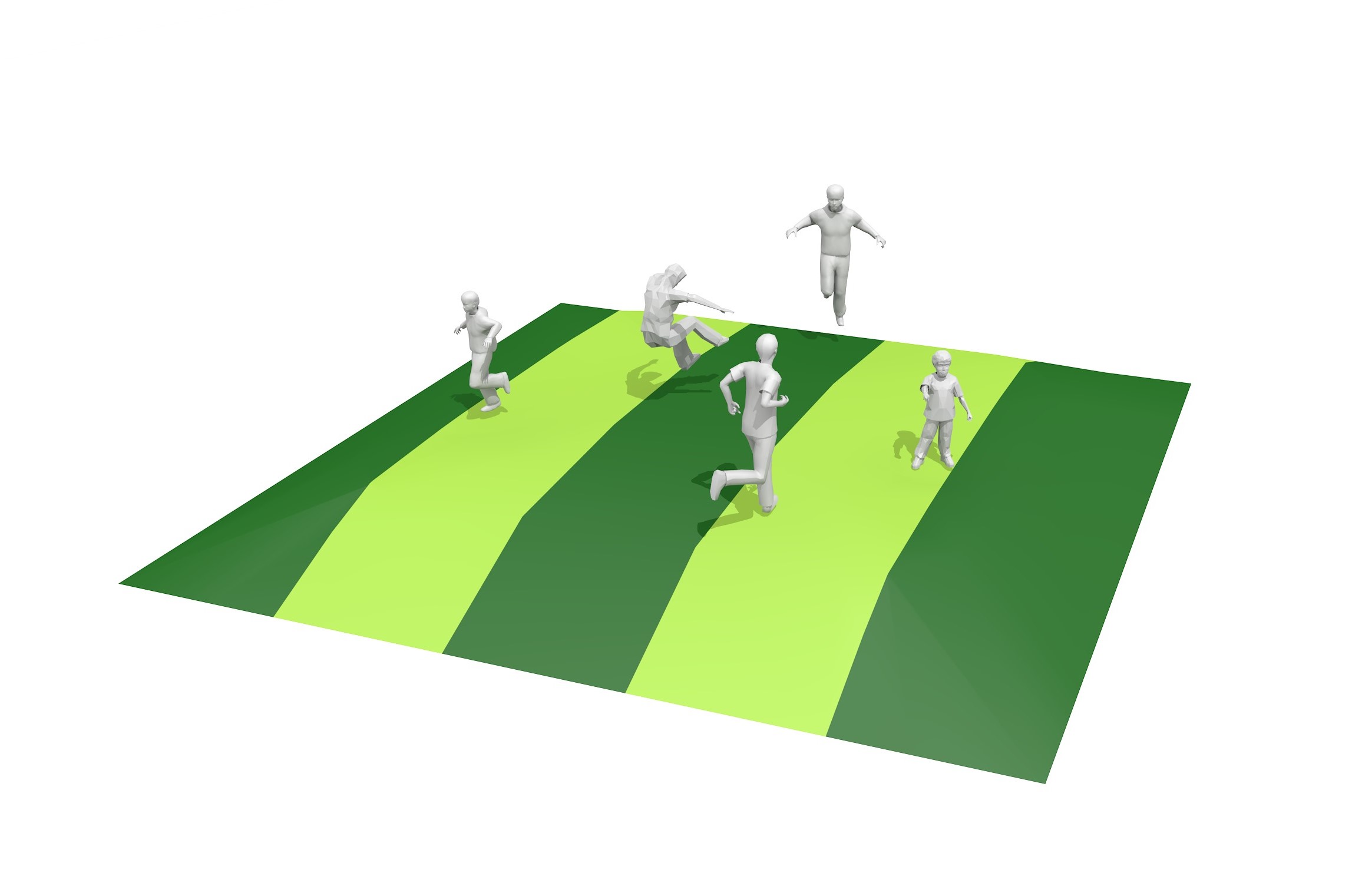 Es wird gehüpft, gesprungen und rotiert. Die dynamische Sprungfläche animiert zum Bewegen und Ausprobieren. Gleichzeitig ist dieses Gerät ein Treffpunkt zum Liegen und Verweilen. Hier trifft man sich. Eine Ebene Fläche ist Voraussetzung.