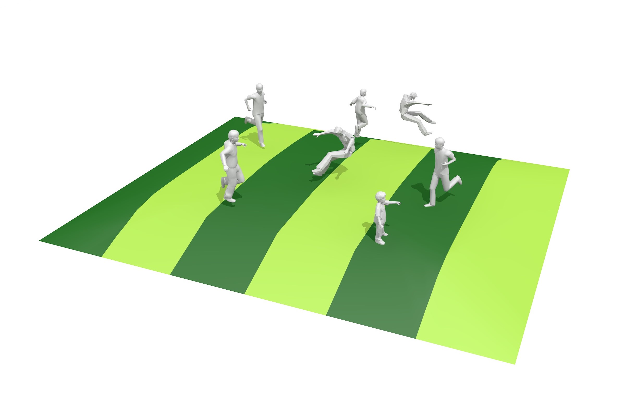Es wird gehüpft, gesprungen und rotiert. Die dynamische Sprungfläche animiert zum Bewegen und Ausprobieren. Gleichzeitig ist dieses Gerät ein Treffpunkt zum Liegen und Verweilen. Hier trifft man sich. Eine Ebene Fläche ist Voraussetzung.