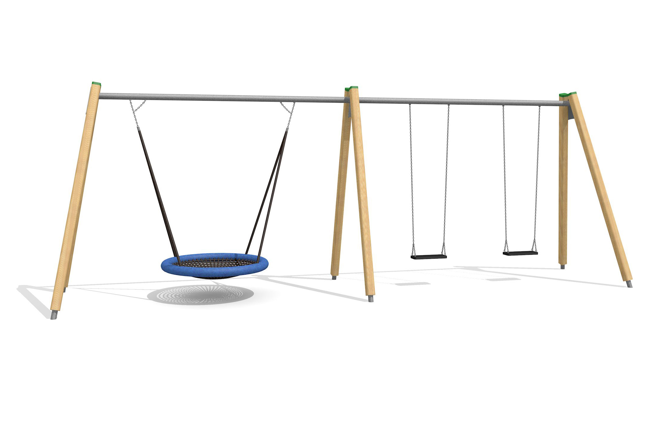 Original Nestschaukel Ø=120 cm, mit wartungsarmen bimbo Schwenklager und Absturzsicherung, 2 Stk. Gummi Schaukelsitze, Gestell in Weisstanne KDI inkl. Stahlkonsolen zum Einbetonieren. Stahlrohrtraverse verzinkt.