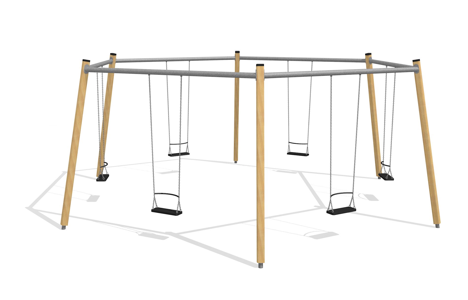 Einzigartiges Schaukelerlebnis. bimbo Schaukelanlagen werden bedürfnisgerecht nach Altersgruppen, Platzangebot und Wünschen geplant. Bei der Sechseckschaukel verhindert ein Sicherheitsbügel, dass es zu Kollisionen kommt.