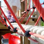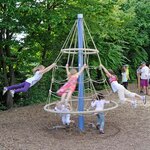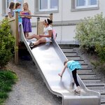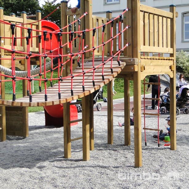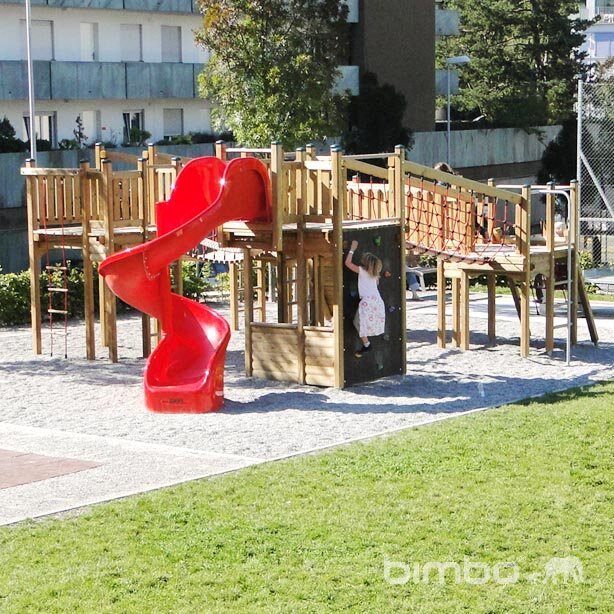 bietet verschiedene Spielangebote und Ruhebereiche für unterschiedliche Altersgruppen. Ausführung in Weisstanne KDI mit Stahlkonsolen. Rutsche in GFK und Edelstahl.