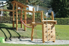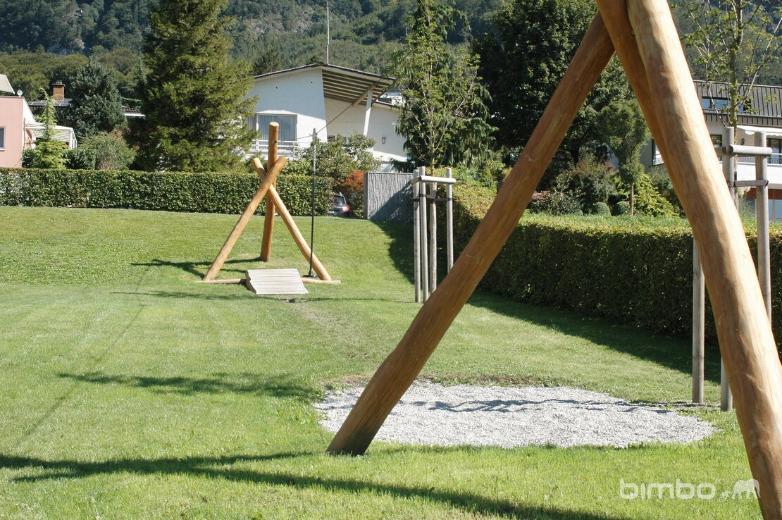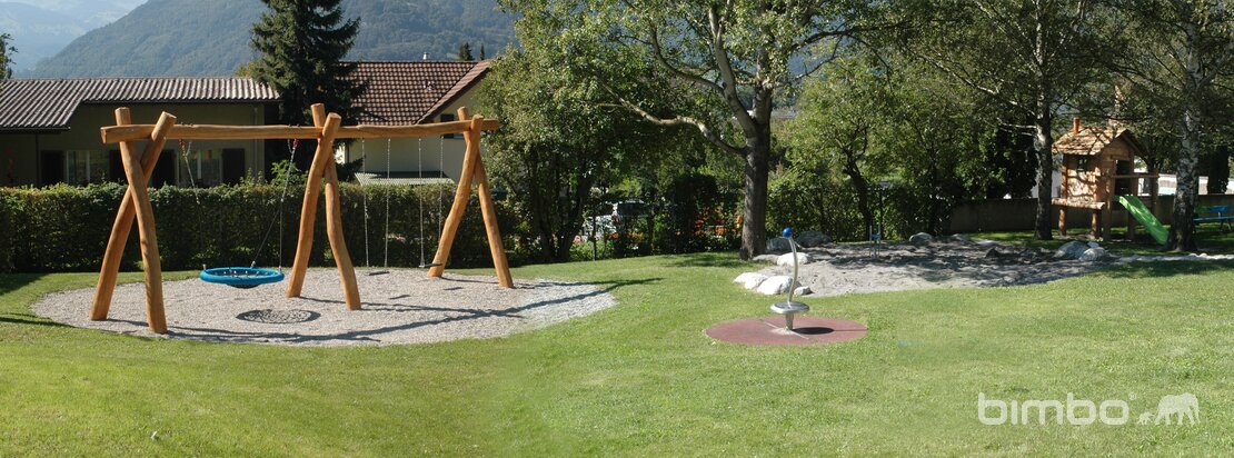 Eine vielseitige Spielwelt in natürlicher Umgebung. Die Anlage ist bei einem Kindergarten und dient gleichzeitig als öffentlicher Spielplatz. Für Jugendliche wurde ein etwas versteckter Bereich mit geeigneten Geräten ausgestattet. bimbo nature Holz Spielgeräte. Fallschutzgruben in Rundkies natürlich angelegt, ohne spezielle Umrandung.