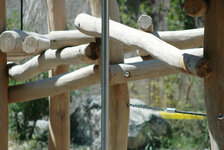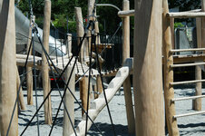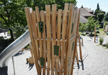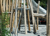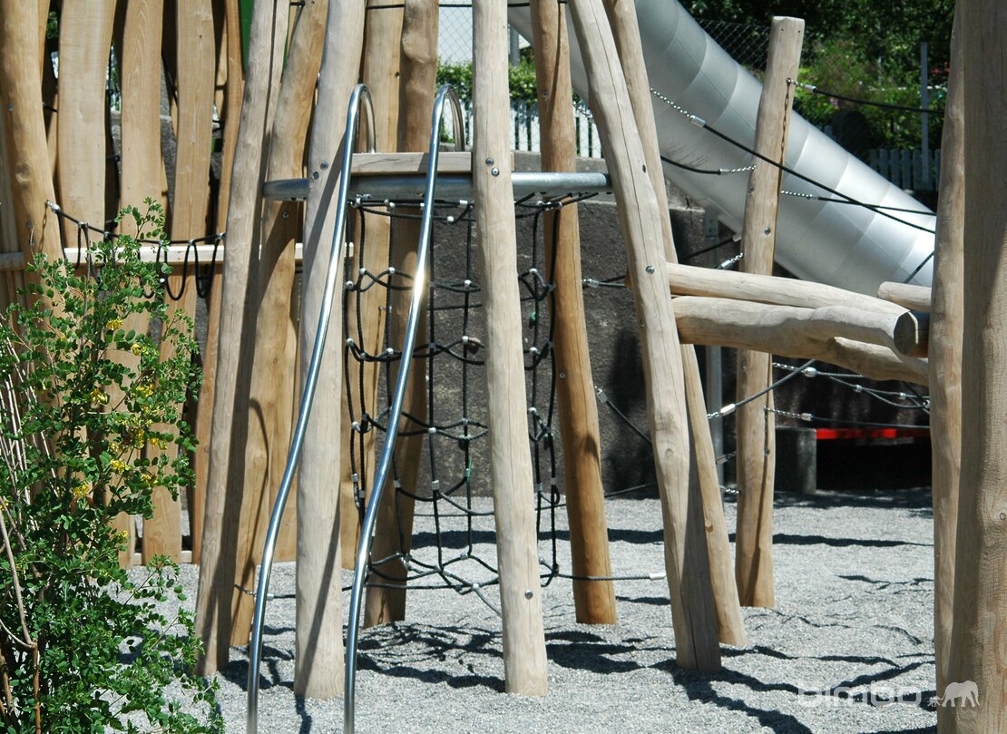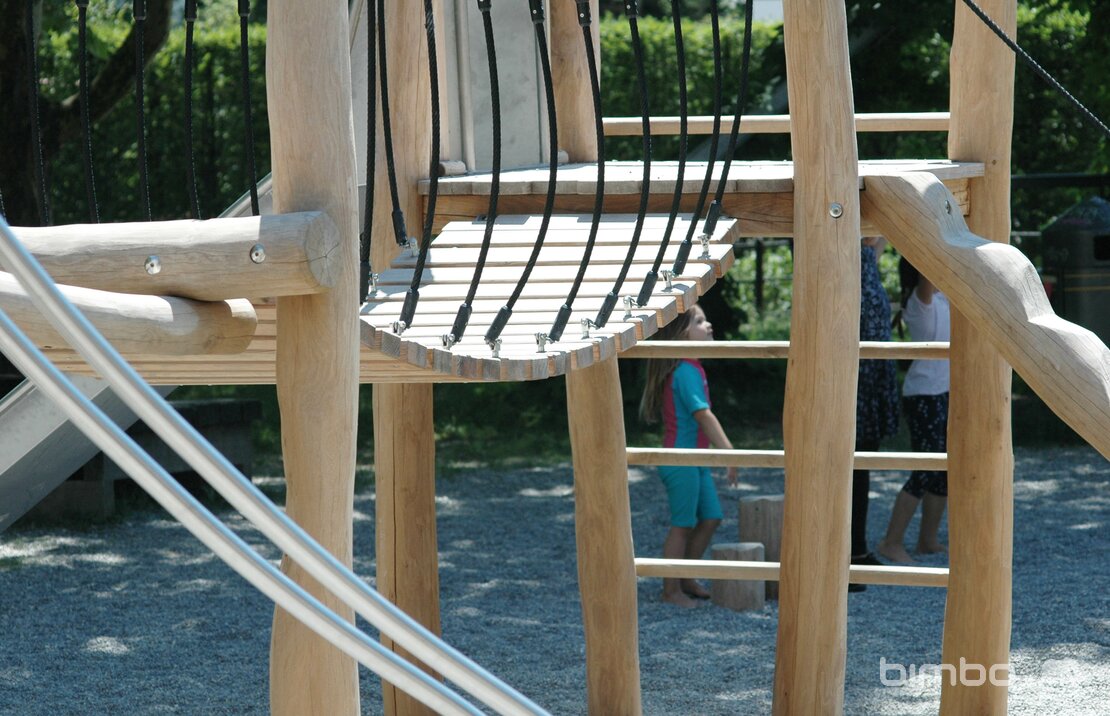 Diese Spielwelt wird in den Schulpausen rege benutzt. Die unterschiedlichen Herausforderungen und Spielmöglichkeiten sind auch in der Freizeit sehr beliebt. Hier trifft man sich. bimbo nature Spielanlage in naturkrummen, unbehandeltem Robinien Hartholz. Fallschutz in Rundkies.