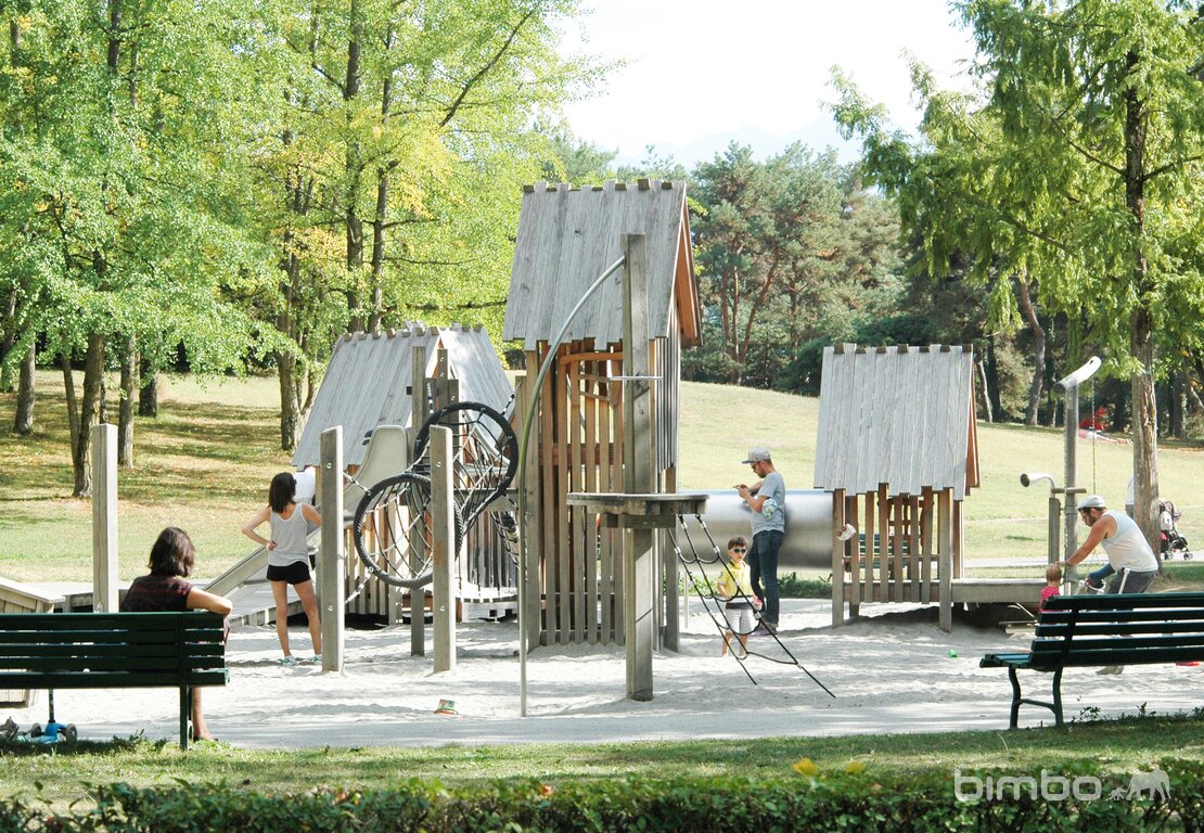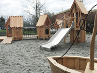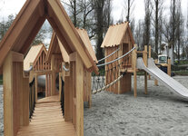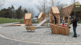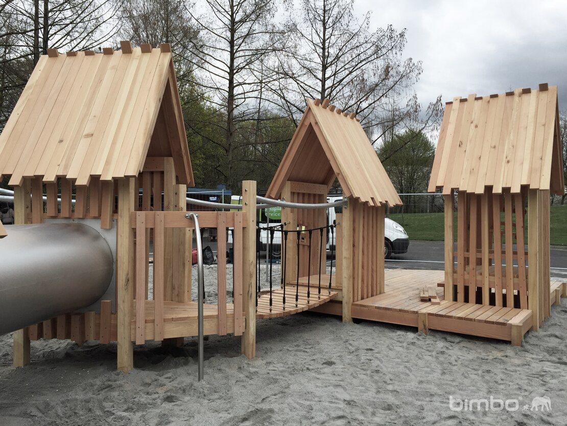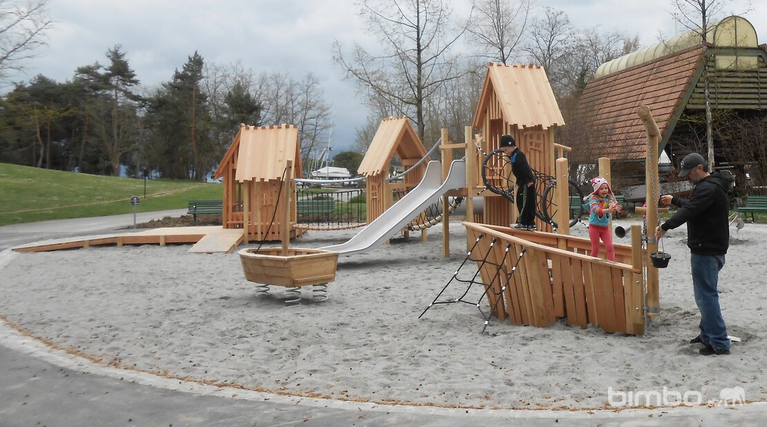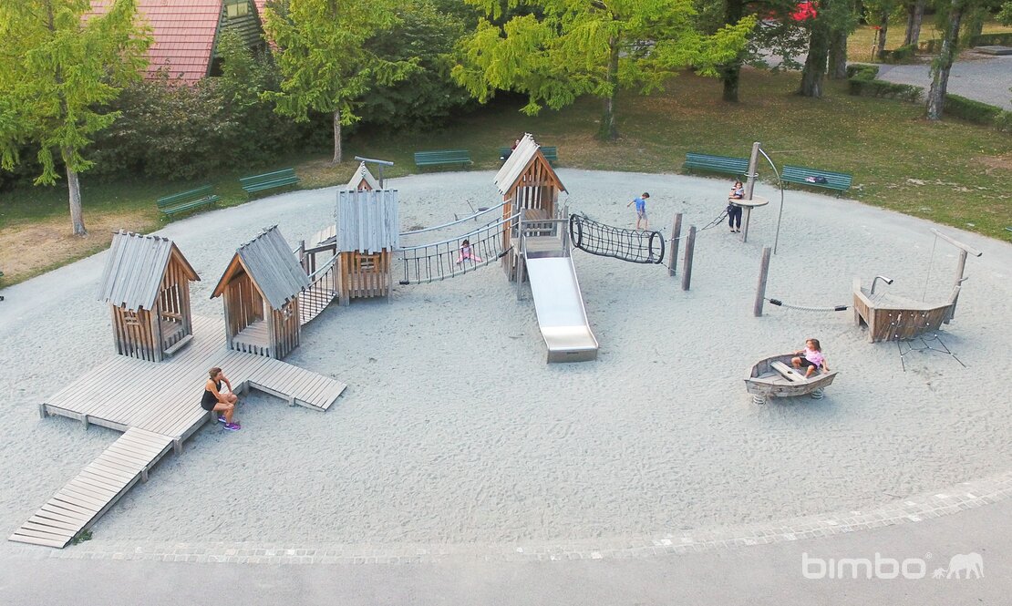 Eine äusserst beliebte, bodennahe Spiellandschaft im Pfahlhaus Stil. Wie bei den Pfahlbauten aus der Urzeit ist auch hier der See nicht weit. Verschiedene Schiffchen, Fischreusen und Netze wurden dem Thema entsprechend integriert. Ausführung in Schweizer Douglasienholz, unbehandelt. In Kombination mit Robinienhartholz. Rutschen und Kletterstangen und Verbindungselemente in Edelstahl.