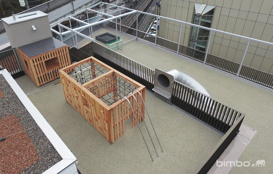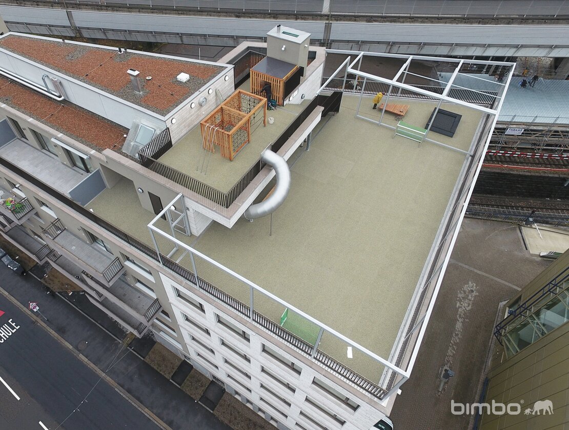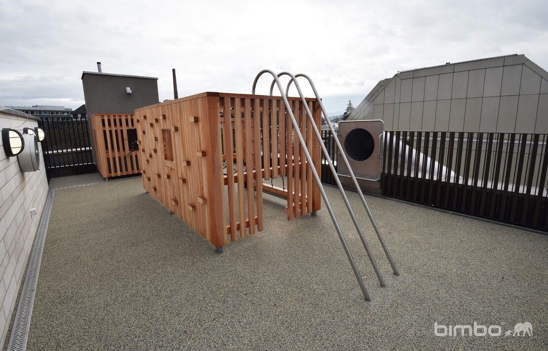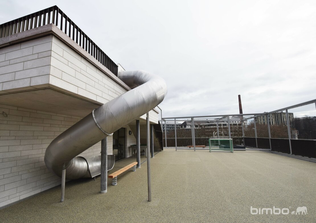 Aus Platzgründen wurde hier der Pausenplatz auf dem Schuldach integriert. Die zwei Nutzebenen sind mit unterschiedlichen Spielgeräten ausgestattet. Es hat verschiedene Nischen und Bewegungsmöglichkeiten. Sogar ein kleiner Sportplatz ist vorhanden. Erhöht ist nicht nur der Standort - auch die technischen Anforderungen waren ausserordentlich. Die geringe Aufbauhöhe auf dem Flachdach verlangte Spezialwissen und technische Sonderdetails.