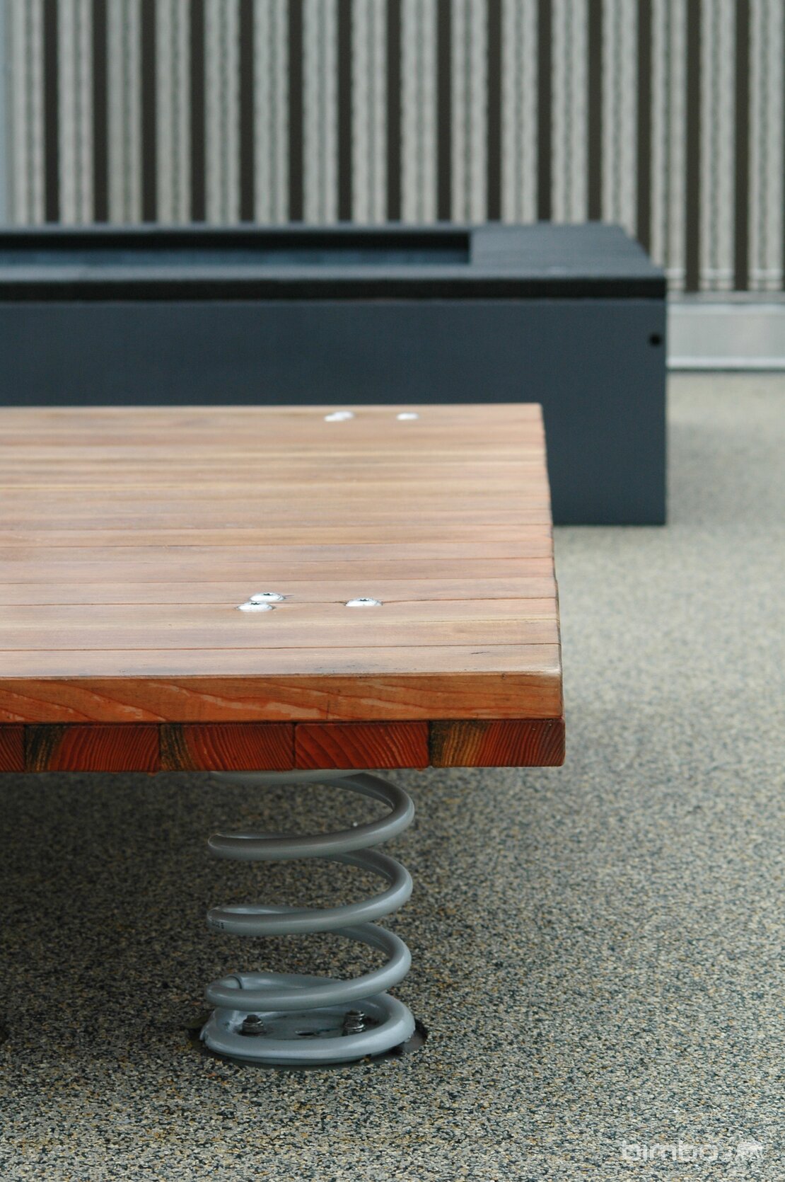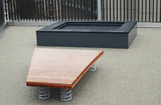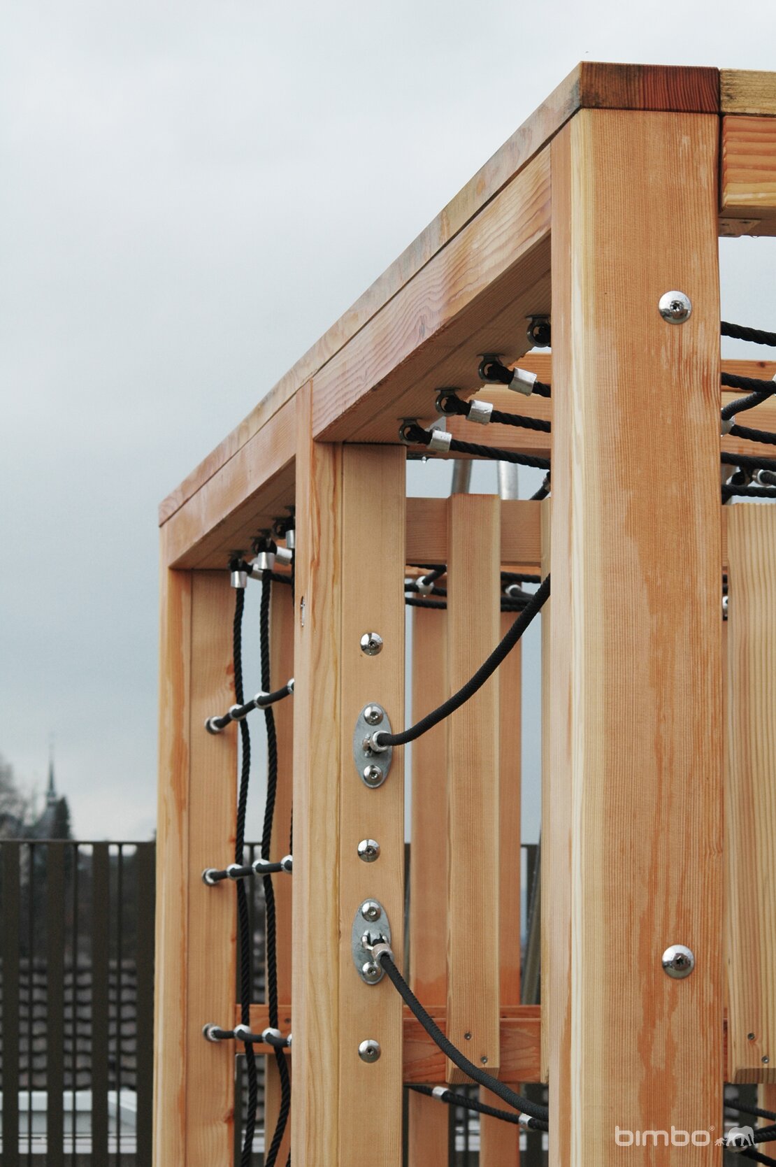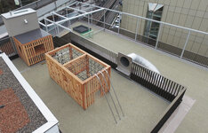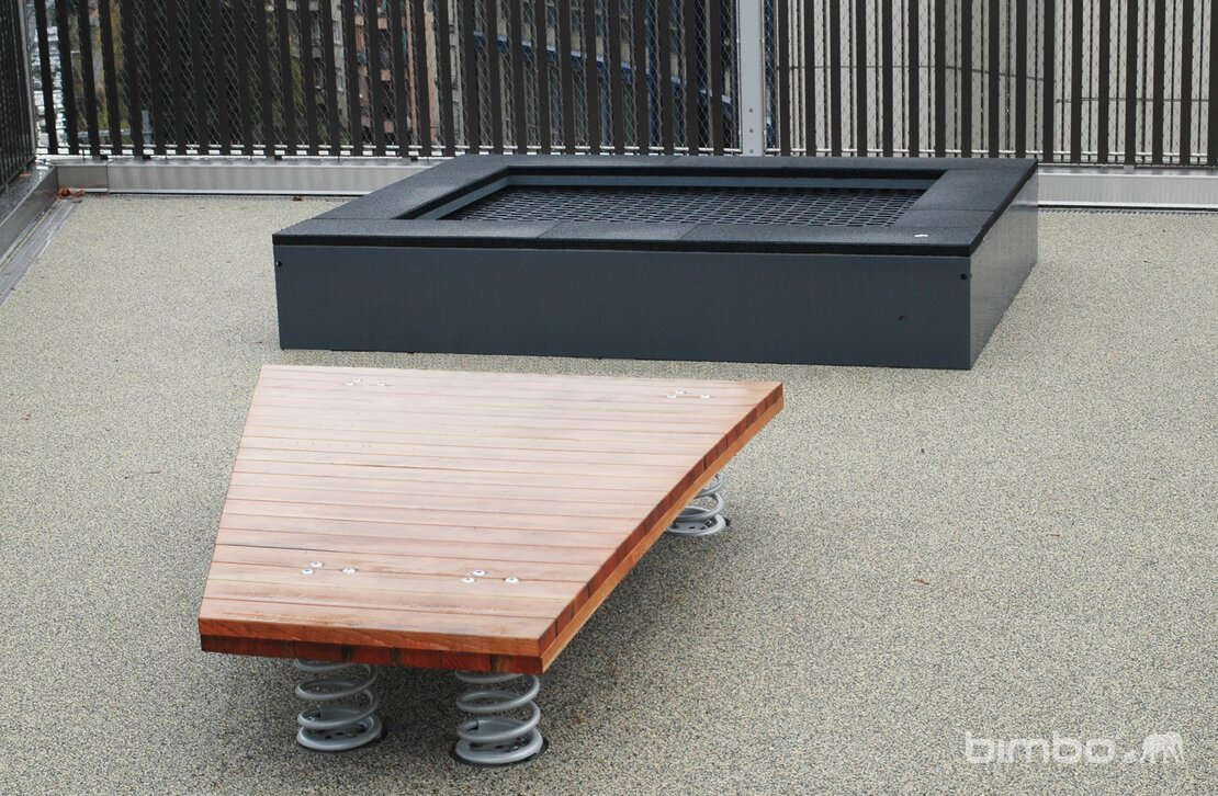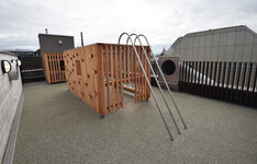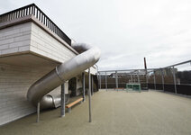 Aus Platzgründen wurde hier der Pausenplatz auf dem Schuldach integriert. Die zwei Nutzebenen sind mit unterschiedlichen Spielgeräten ausgestattet. Es hat verschiedene Nischen und Bewegungsmöglichkeiten. Sogar ein kleiner Sportplatz ist vorhanden. Erhöht ist nicht nur der Standort - auch die technischen Anforderungen waren ausserordentlich. Die geringe Aufbauhöhe auf dem Flachdach verlangte Spezialwissen und technische Sonderdetails.