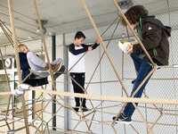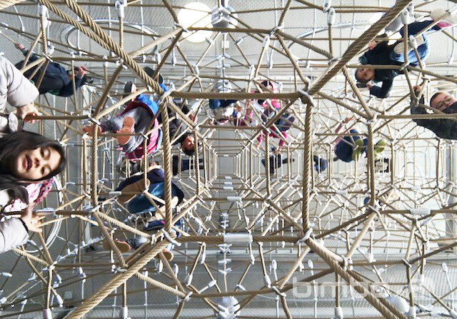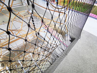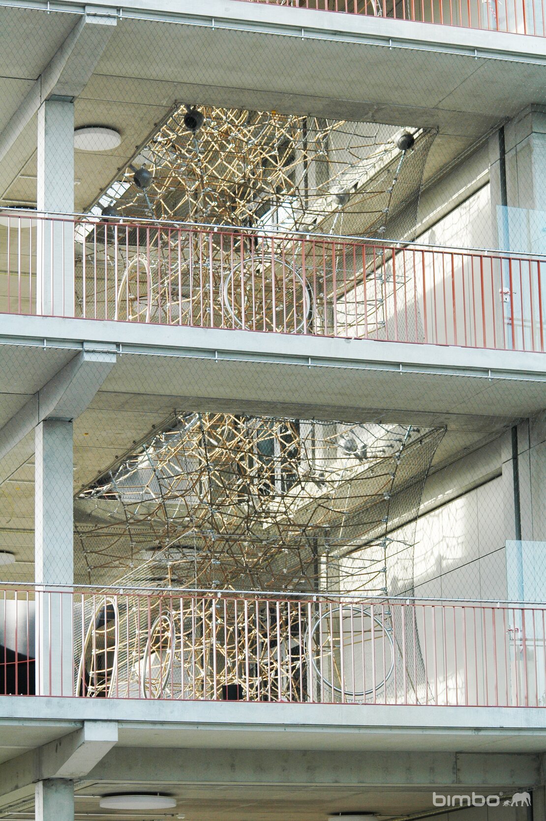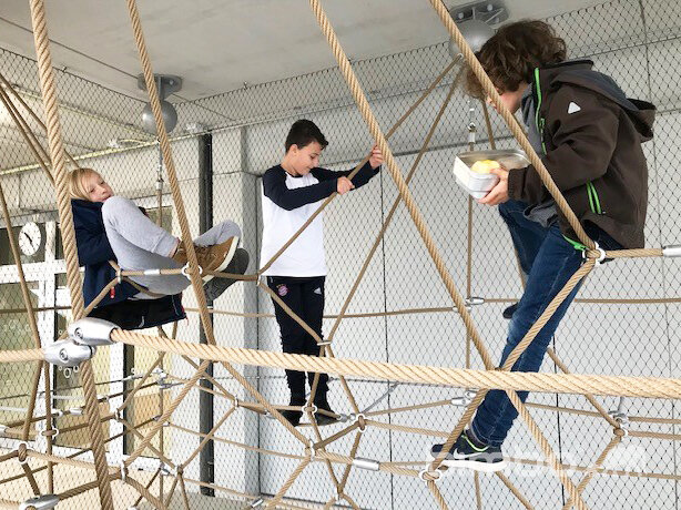 Einzigartiges Klettererlebnis in luftige Höhen. Diese Raumnetzstruktur überwindet drei Etagen - ein cooler Pausenspass für die Kinder. Das Kletternetz ist das Resultat einer Partizipation mit den Kindern. Seilnetzstrukur der Berliner Seilfabrik in perfekter Bearbeitung. 6-Litzige Stahlkern Seile mit Polyamid Ummantelung. Aussen dient ein transparentes Webnet als Sicherheitsabschluss.