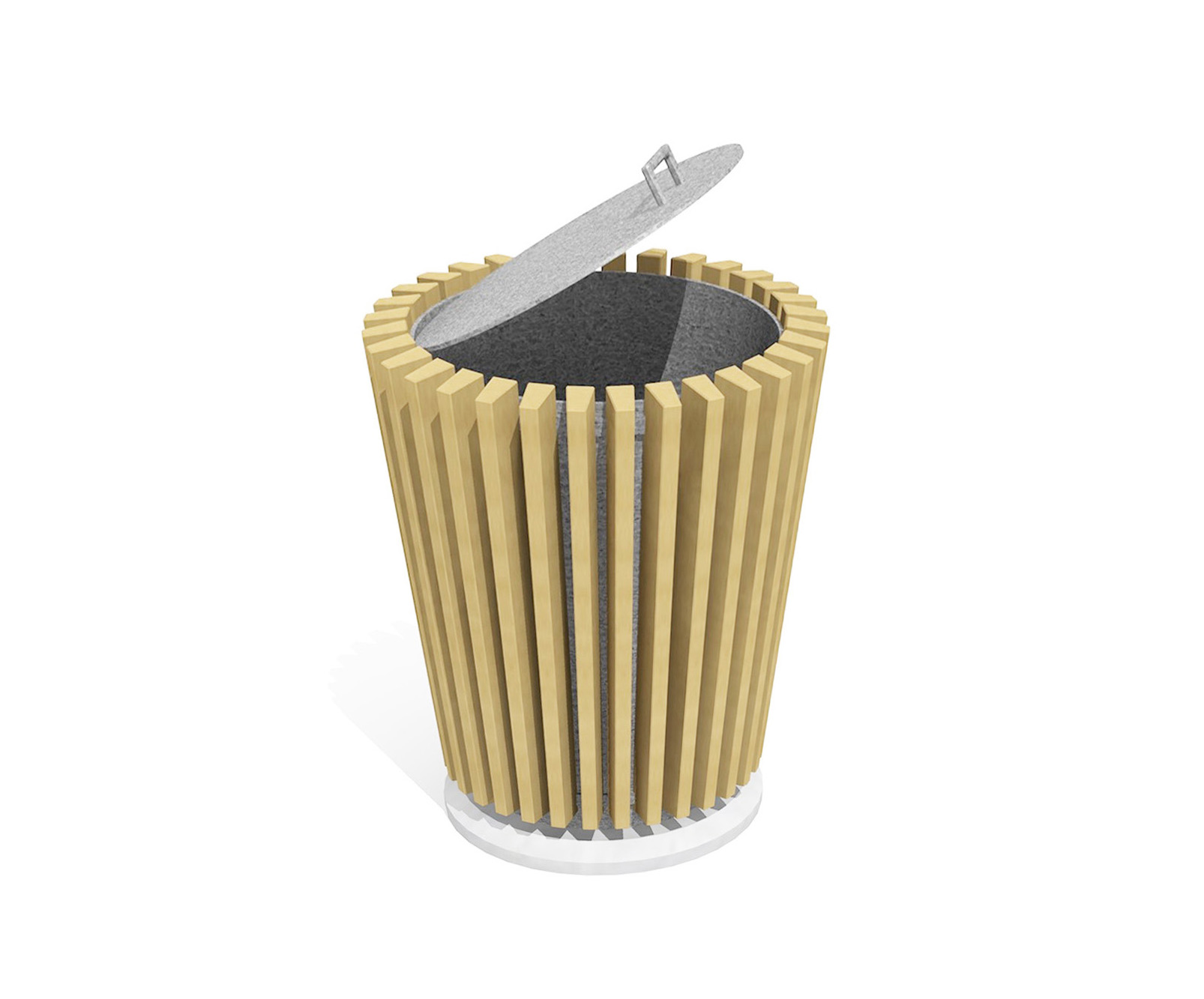 Lattes en bois de résineux imprégné. Bac intérieur en métal zingué et socle en béton.