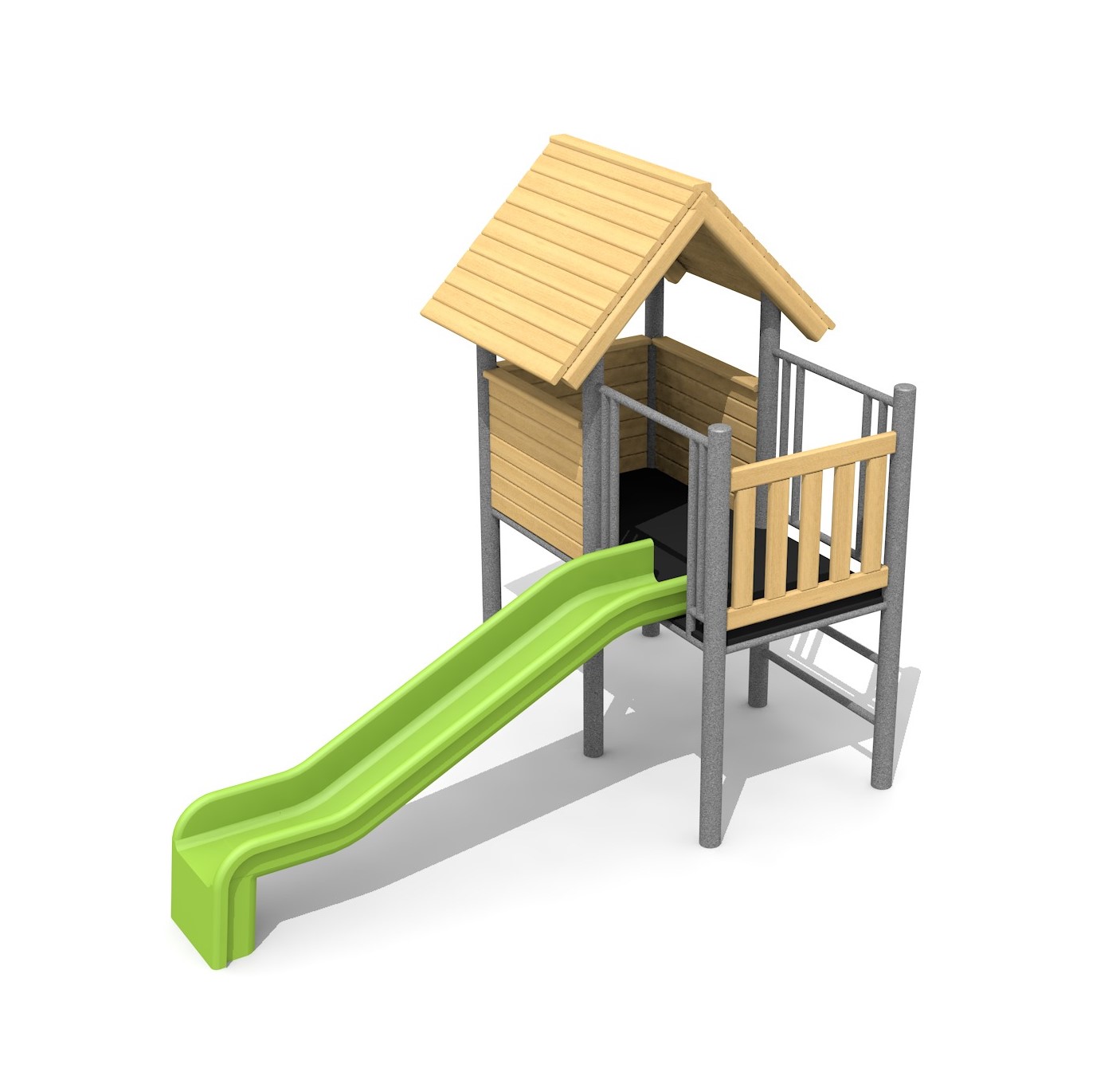 Construction solide en acier galvanisé, éléments en bois en sapin local autoclave. Toboggan en polyester.