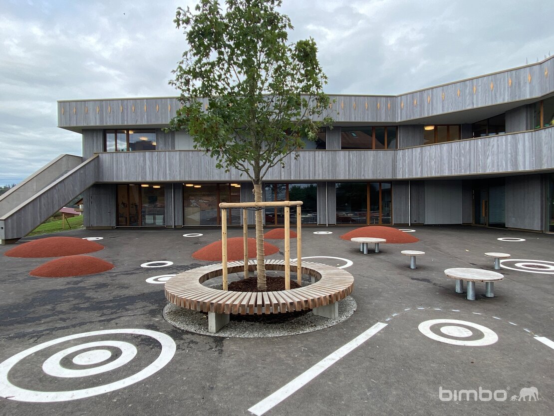 Lattage en douglas / mélèze indigène. Pieds en béton. Une apparition de sève n’est pas exclue les premiers temps. Sur demande, exécution en bois dur frêne thermo chauffé indigène.