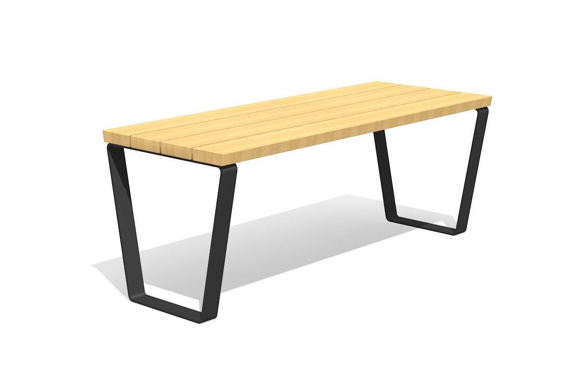 En bois dur FSC, non traité. Armature en aluminium revêtu. Les pieds ont des perforations pour un ancrage au sol. En couleur gris argenté ou anthracite.