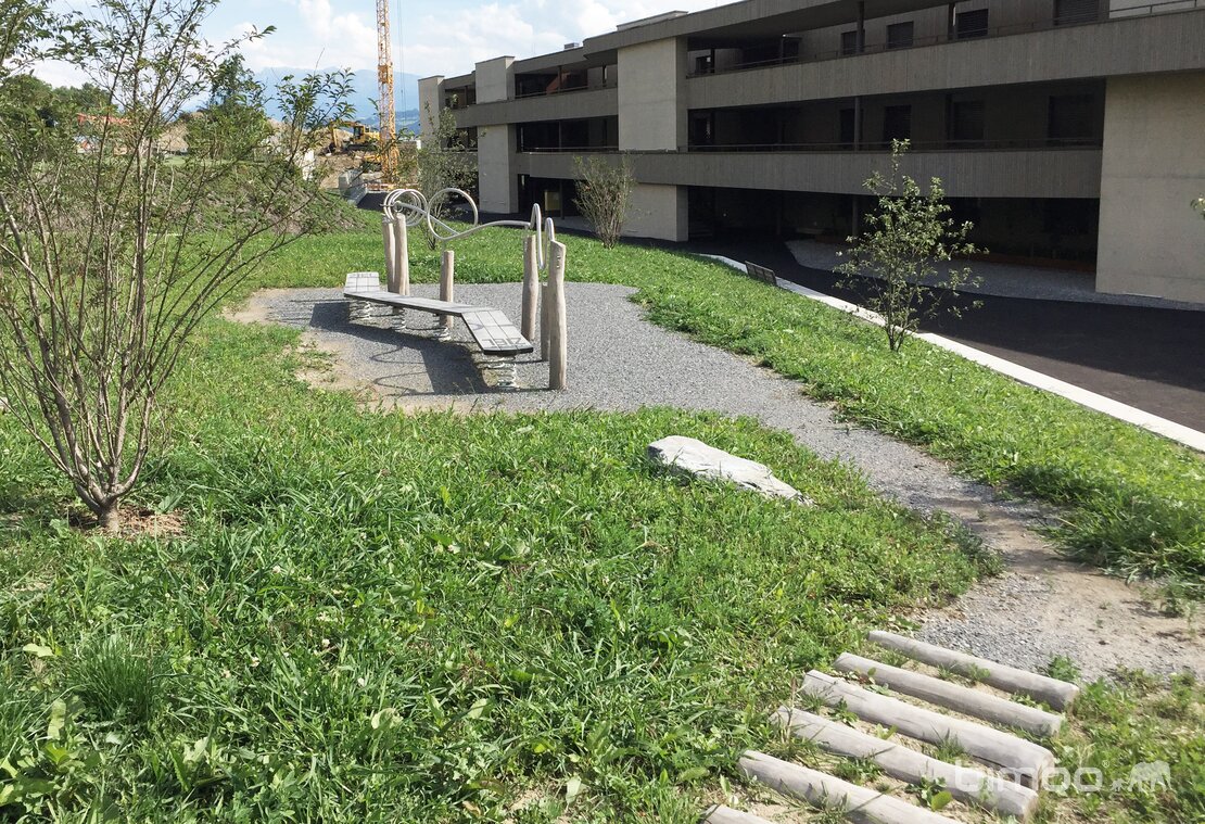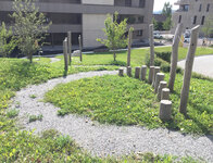 Le grand environnement naturel de ce quartier invite à se prélasser. Divers cheminements avec divers éléments d'équilbre sont bordés par de nombreux jeunes arbres et plantations. Exécution en bois naturels non traités en combinaison avec des éléments en inox et des cordes noires.