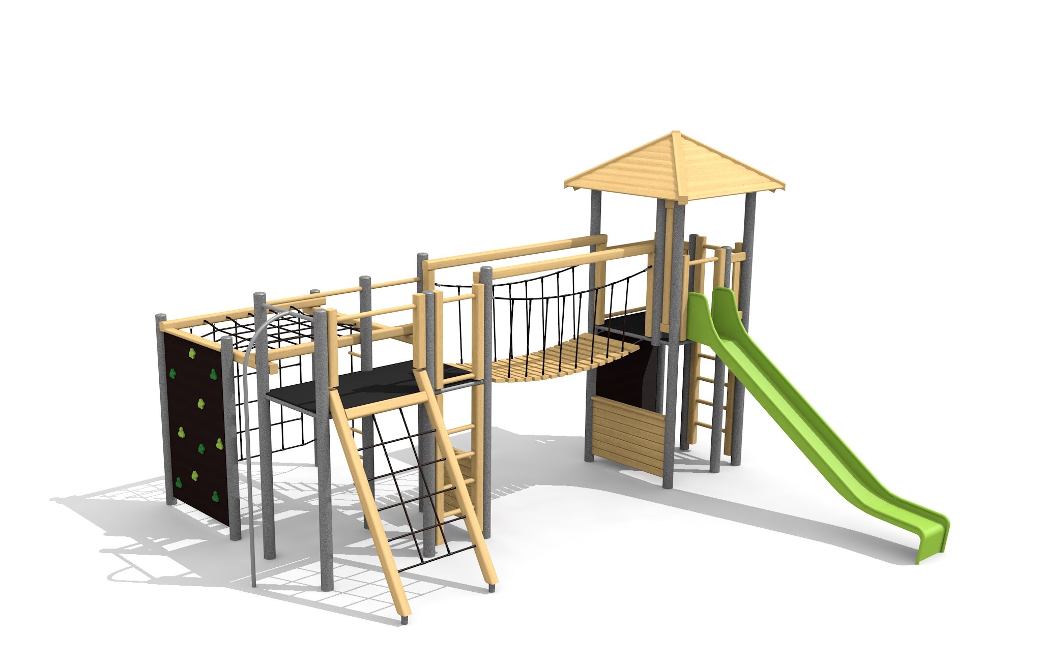 Construction solide en acier galvanisé, éléments en bois en sapin local autoclave. Toboggan en polyester. Cordes armées en acier.