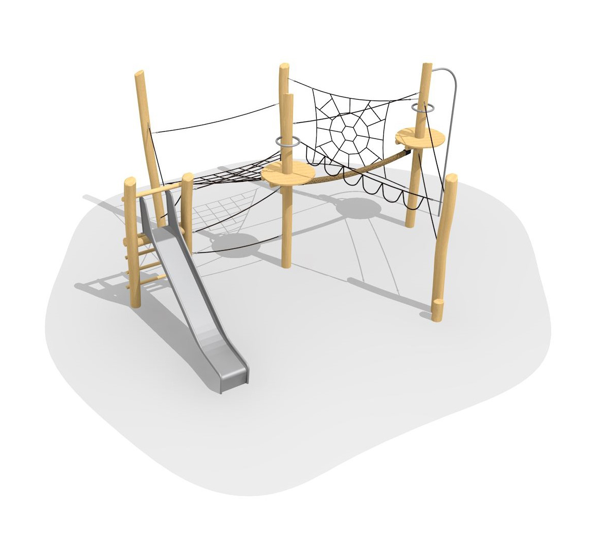 Bois de robinier massif, croissance naturelle, non traité. Cordes armées antivandalisme. Pièces métalliques en inox. Toboggan en polyester.