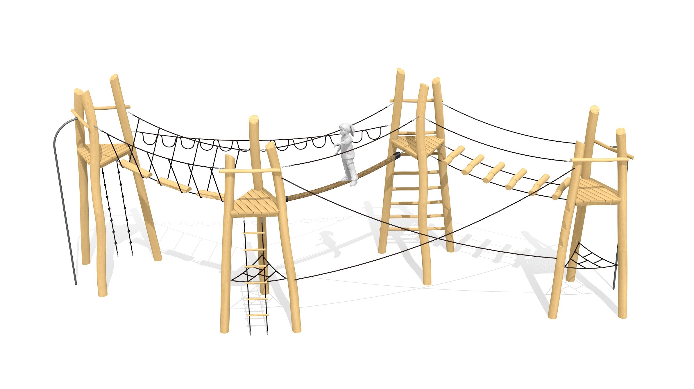 Bois de robinier massif, croissance naturelle, non traité. Cordes armées antivandalisme. Pièces métalliques en inox. Surface du bois lasurée écologiquement.