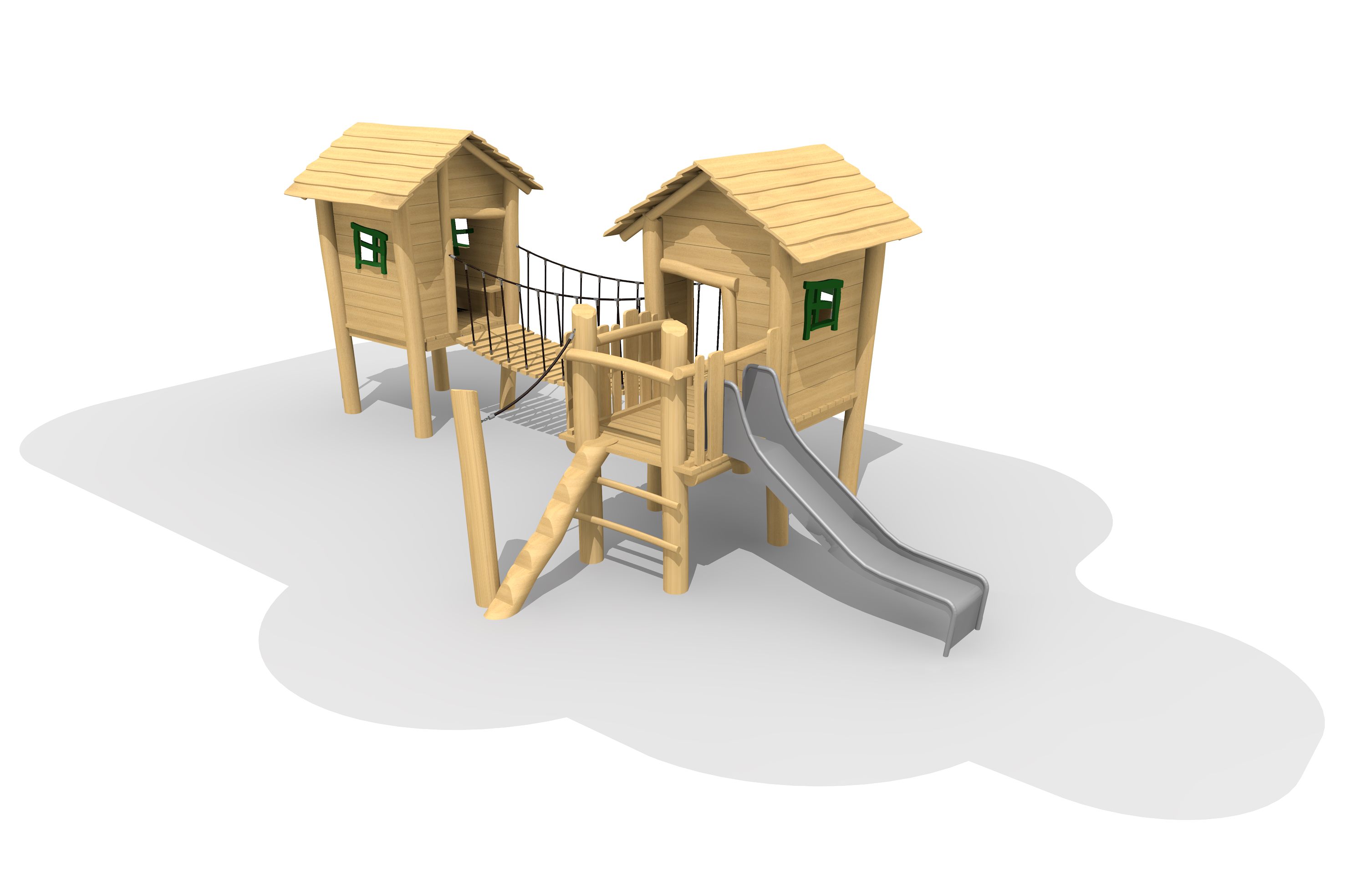 En bois de robinier massif, croissance naturelle, non traité. Cordes armées antivandalisme. Parties métalliques en inox. Toboggan en polyester.