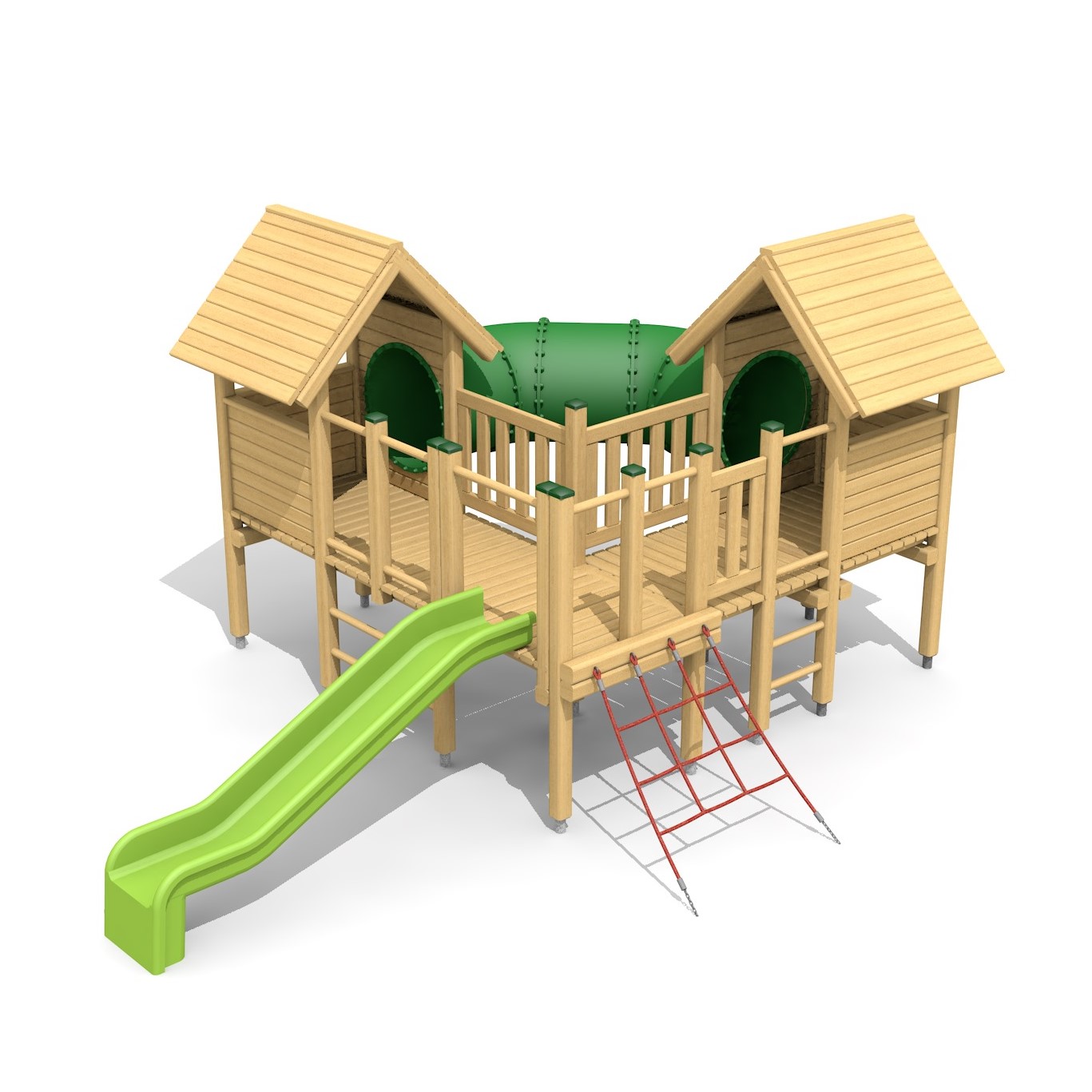 Bois résineux massif. Socle en métal zingué à chaud inclus. Toboggan et tunnel en polyester. Cordes armées en acier.