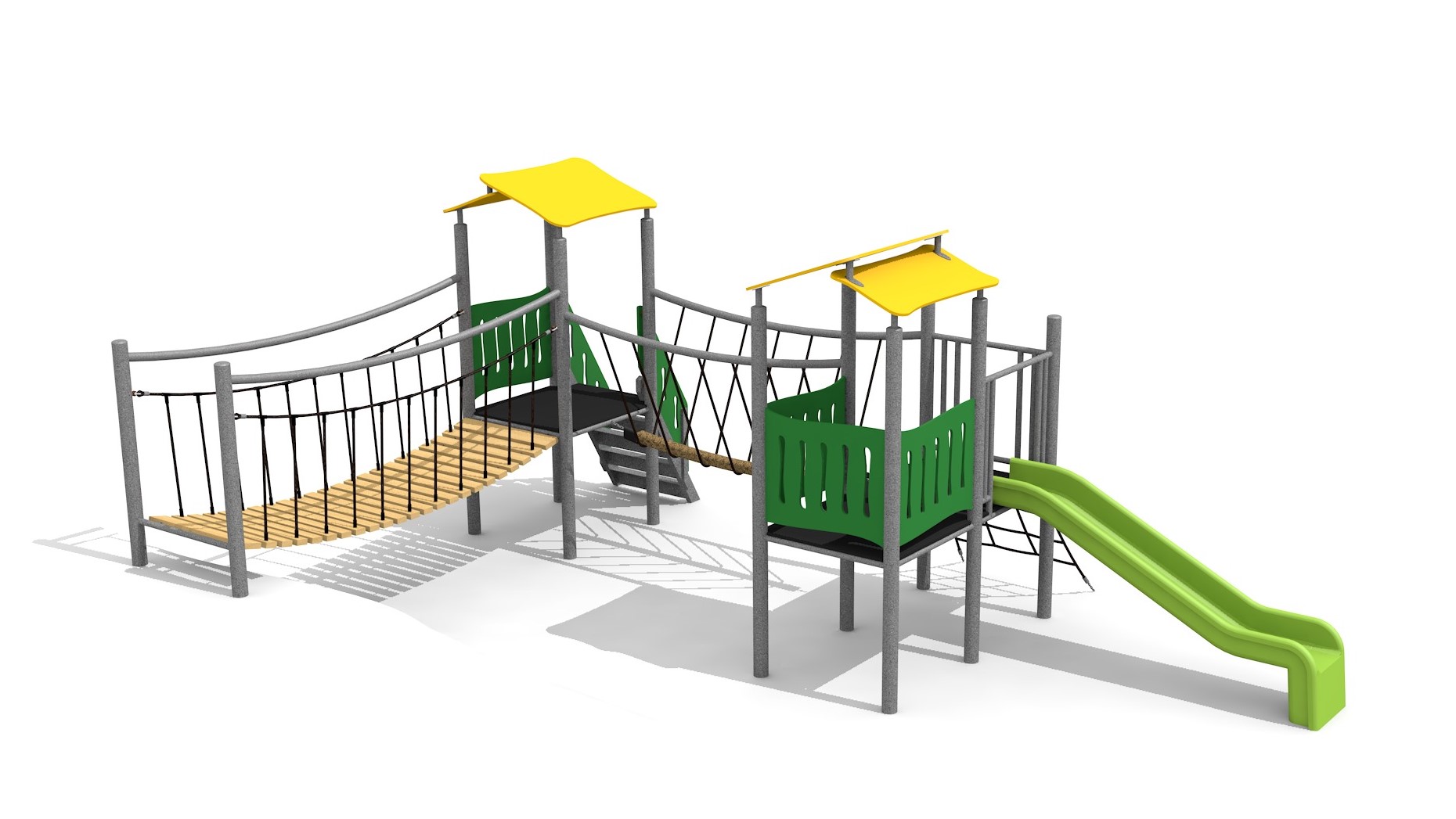 Construction solide en acier galvanisé, panneaux en matière synthétique résistant aux intempéries, combinaison de couleur, jaune-vert ou sur demande. Toboggan en polyester. Cordes armées en acier.