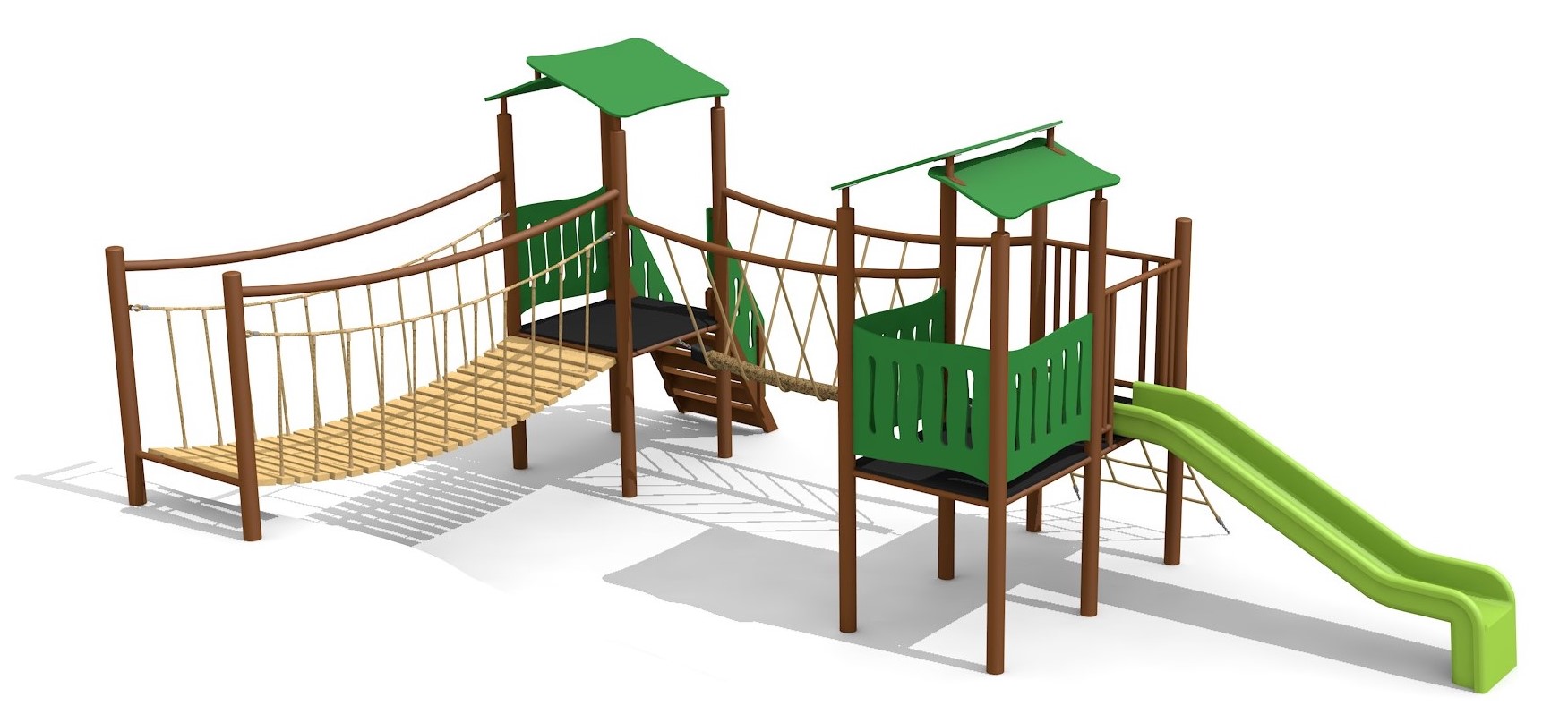 Construction solide en acier galvanisé et couleur, panneaux en matière synthétique résistant aux intempéries, combinaison de couleur, brun-vert ou sur demande. Toboggan en polyester. Cordes armées en acier.