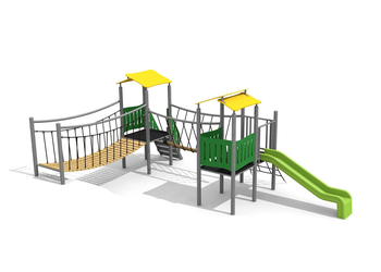 Construction solide en acier galvanisé, panneaux en matière synthétique résistant aux intempéries, combinaison de couleur, jaune-vert ou sur demande. Toboggan en polyester. Cordes armées en acier.