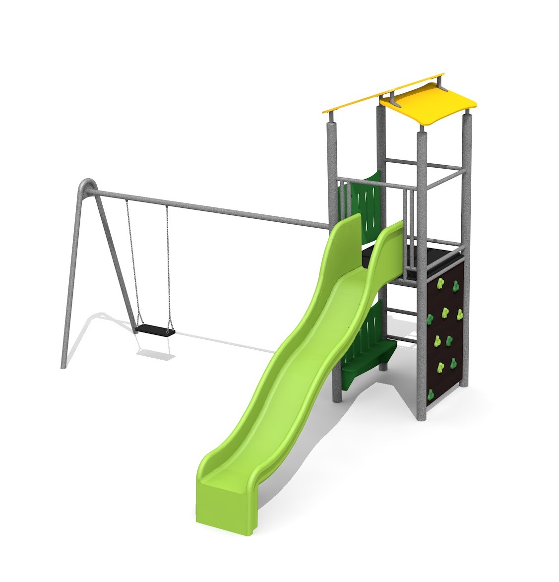 Construction solide en acier galvanisé, panneaux en matière synthétique résistant aux intempéries, combinaison de couleur, jaune-vert ou sur demande. Toboggan en polyester. Cordes armées en acier.