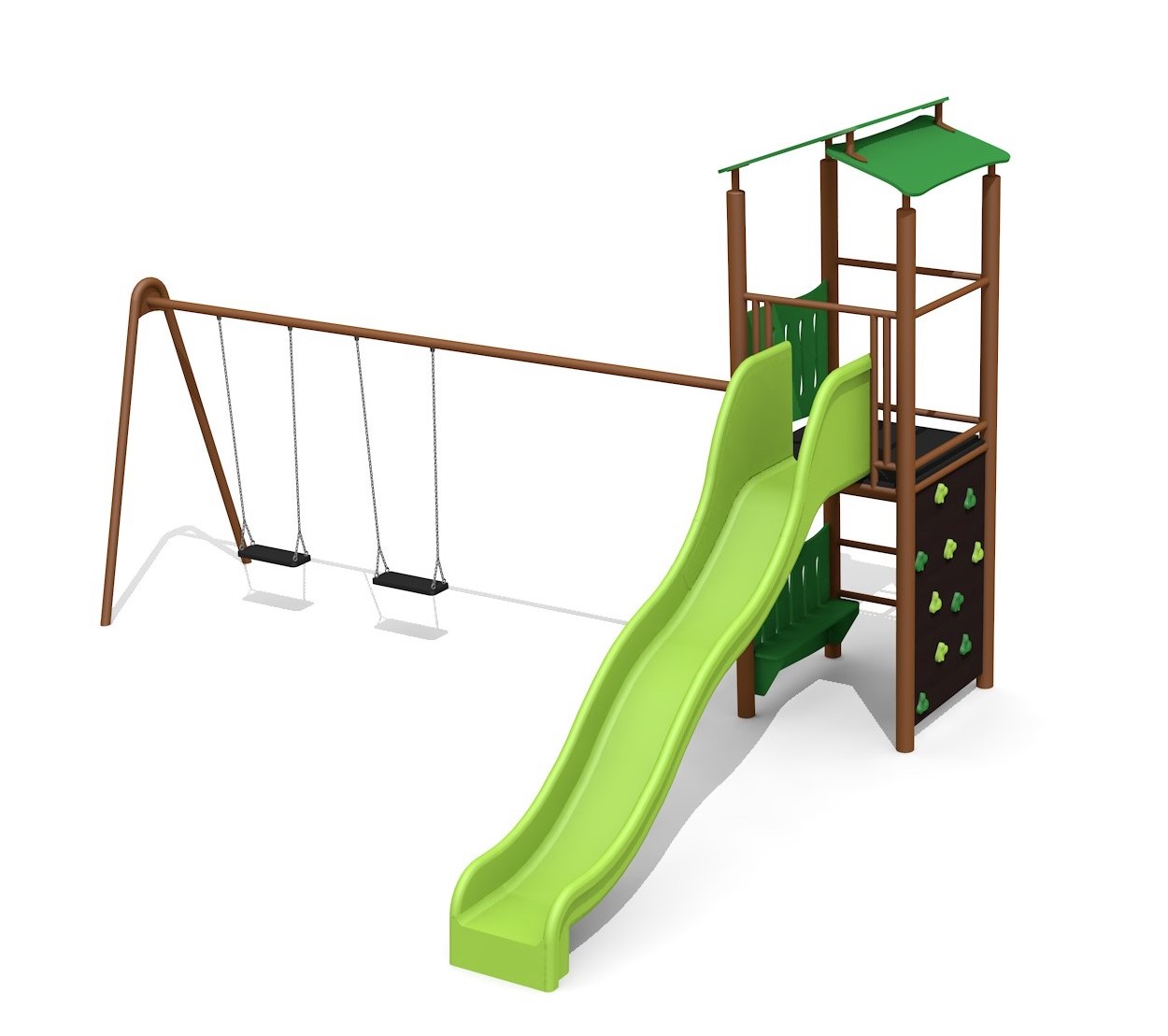 Construction solide en acier galvanisé et couleur, panneaux en matière synthétique résistant aux intempéries, combinaison de couleur, brun-vert ou sur demande. Toboggan en polyester. Cordes armées en acier.
