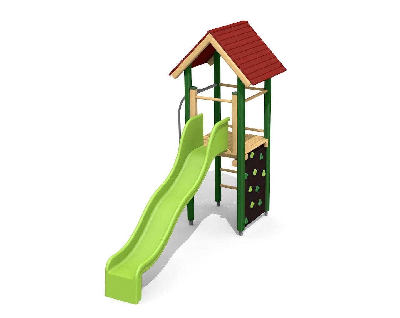 Bois résineux massif, lasurée en couleur. Socle en métal zingué à chaud inclus. Toboggan en polyester. Cordes armées en acier.