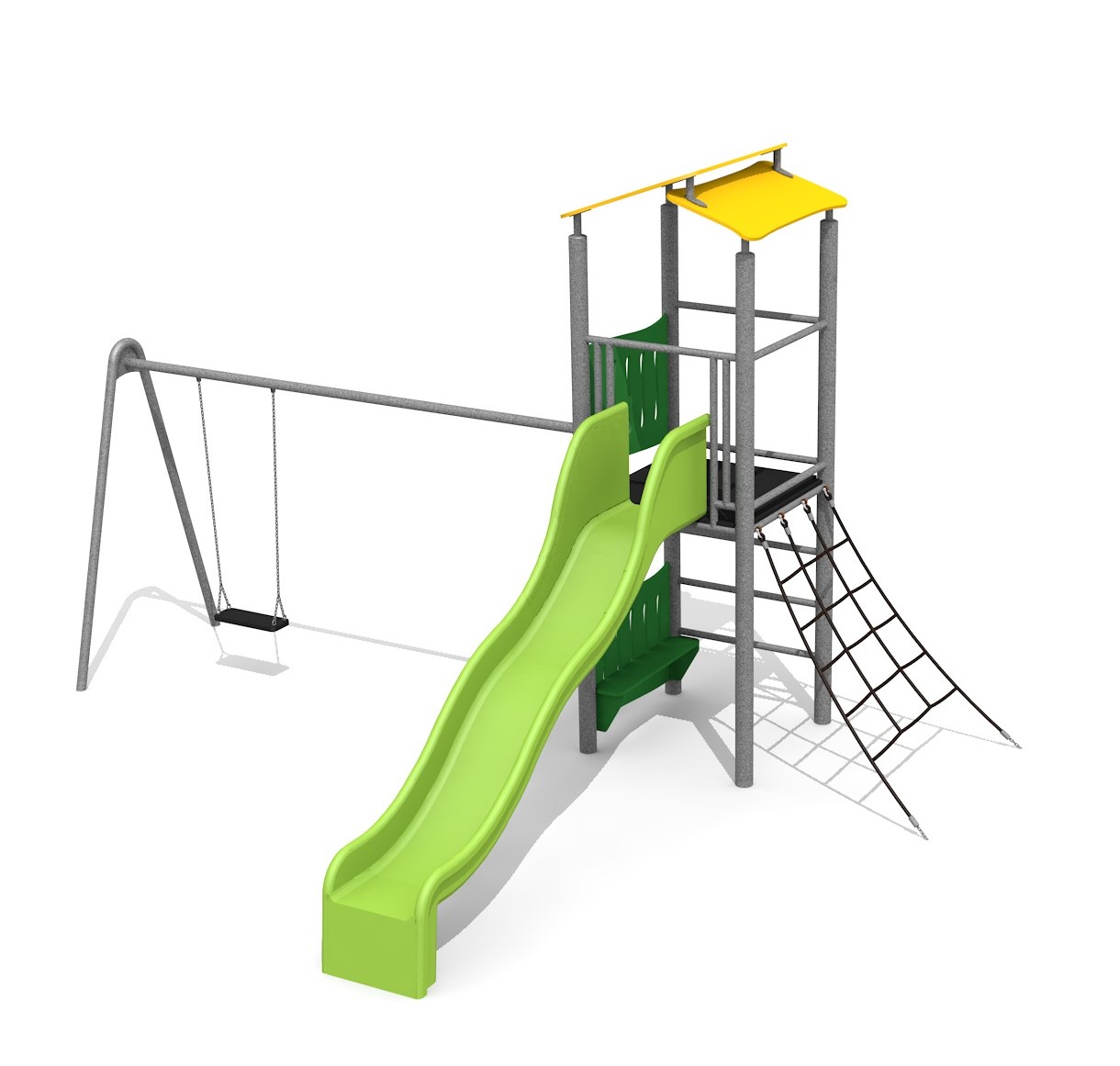 Construction solide en acier galvanisé, panneaux en matière synthétique résistant aux intempéries, combinaison de couleur, jaune-vert ou sur demande. Toboggan en polyester. Cordes armées en acier.