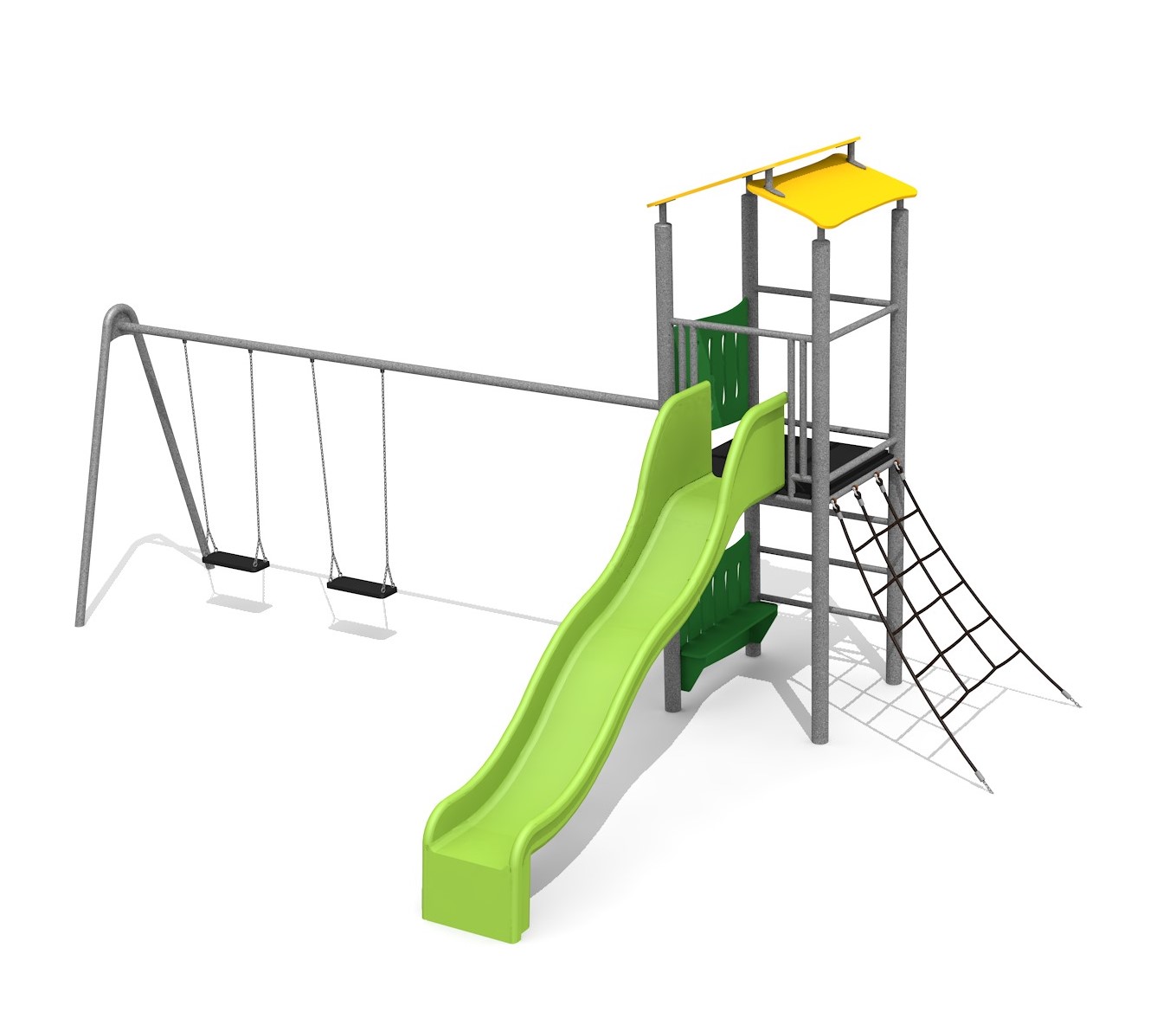 Construction solide en acier galvanisé, panneaux en matière synthétique résistant aux intempéries, combinaison de couleur, jaune-vert ou sur demande. Toboggan en polyester. Cordes armées en acier.