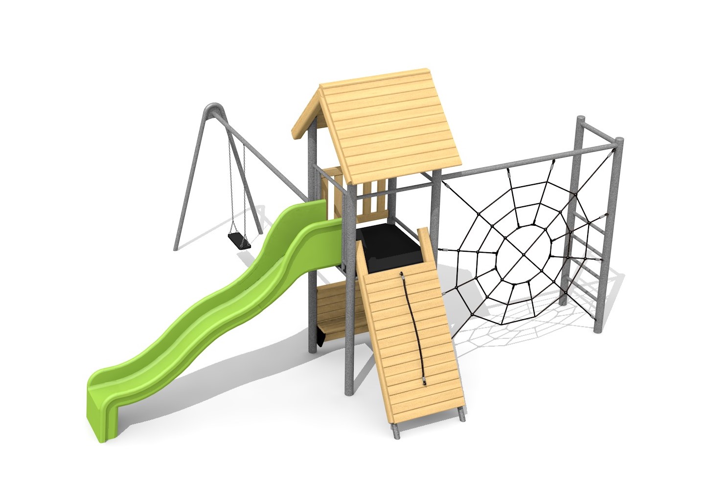 Ce petit paysage à grimper présente de nombreuses possibilités pour les petits. La toile d’araignée attire l’oeil. Avec une balançoire, c’est une combinaison de jeux complète sur une très petite surface.