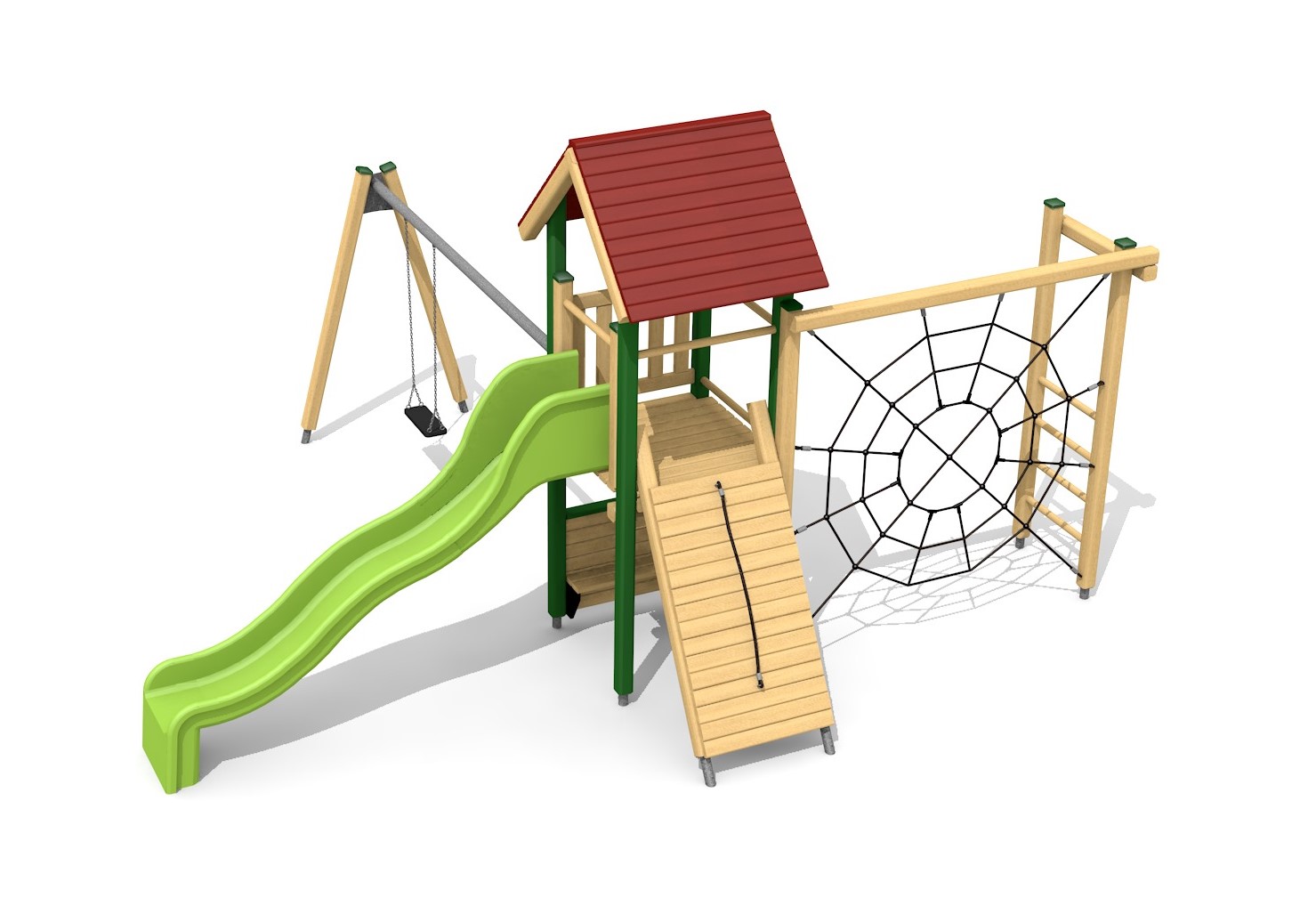 Ce petit paysage à grimper présente de nombreuses possibilités pour les petits. La toile d’araignée attire l’oeil. Avec une balançoire, c’est une combinaison de jeux complète sur une très petite surface.