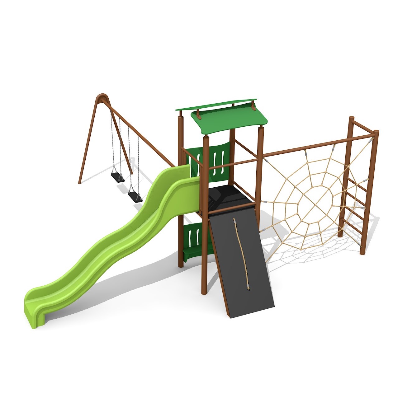 Construction solide en acier galvanisé et couleur, panneaux en matière synthétique résistant aux intempéries, combinaison de couleur, brun-vert ou sur demande. Toboggan en polyester. Cordes armées en acier.