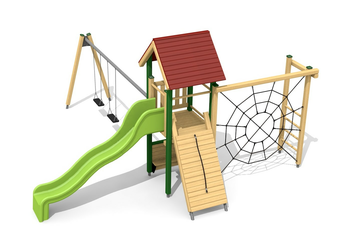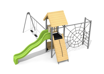 Ce petit paysage à grimper présente de nombreuses possibilités pour les petits. La toile d’araignée attire l’oeil. Avec une balançoire, c’est une combinaison de jeux complète sur une très petite surface.
