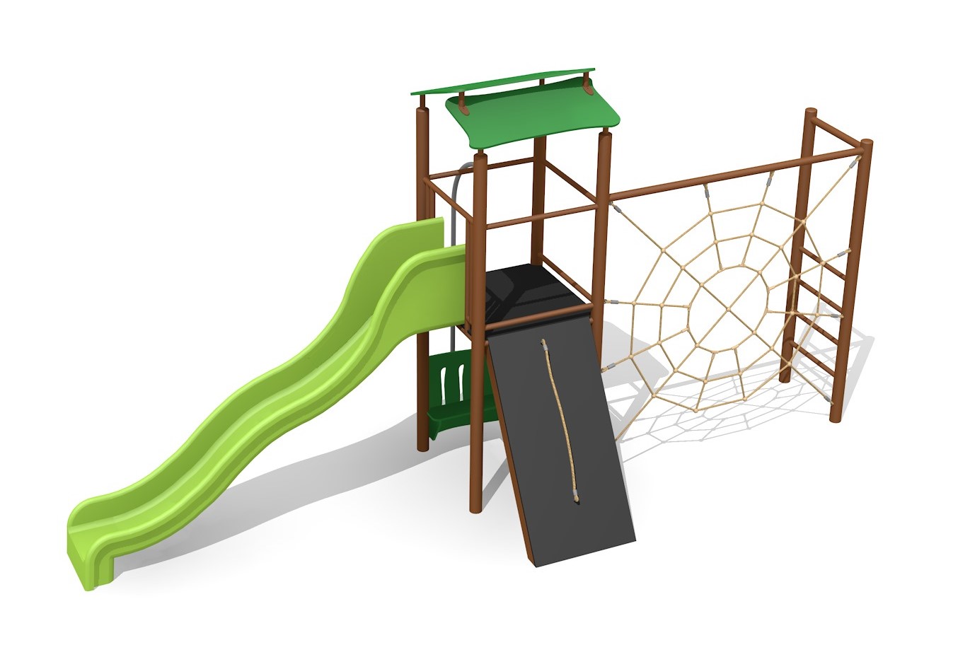 Construction solide en acier galvanisé et couleur, panneaux en matière synthétique résistant aux intempéries, combinaison de couleur, brun-vert ou sur demande. Toboggan en polyester. Cordes armées en acier.