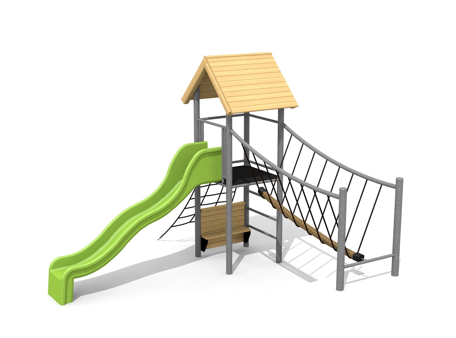 Construction solide en acier galvanisé, éléments en bois en sapin local autoclave. Toboggan en polyester. Cordes armées en acier.