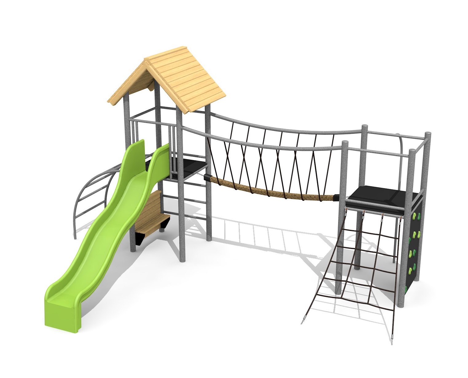 Construction solide en acier galvanisé, éléments en bois en sapin local autoclave. Toboggan en polyester. Cordes armées en acier.